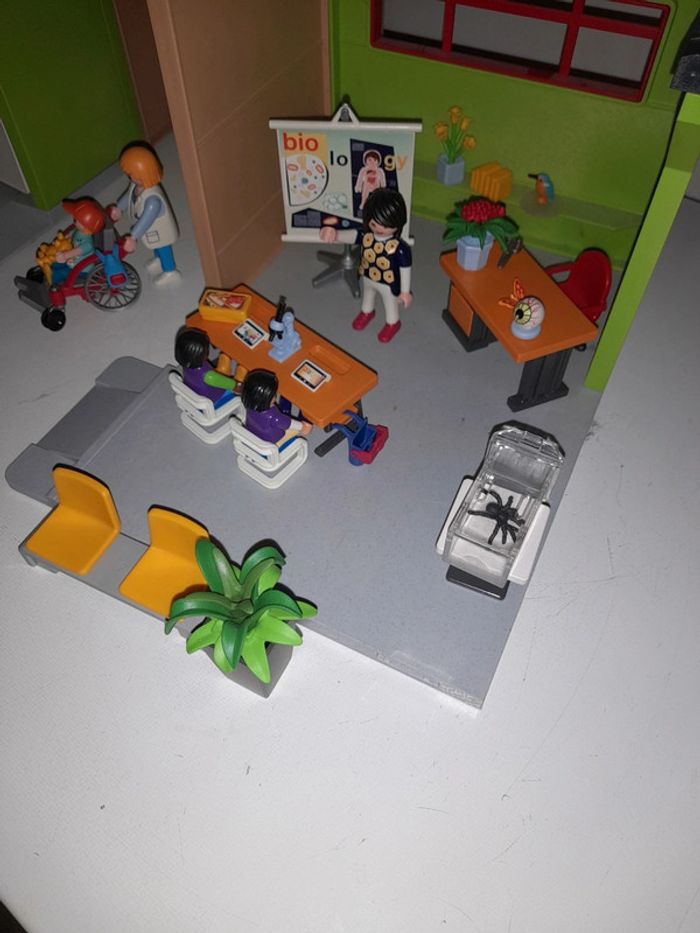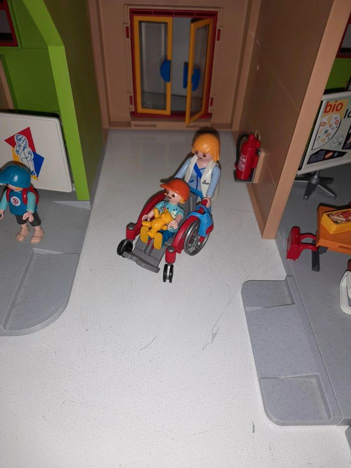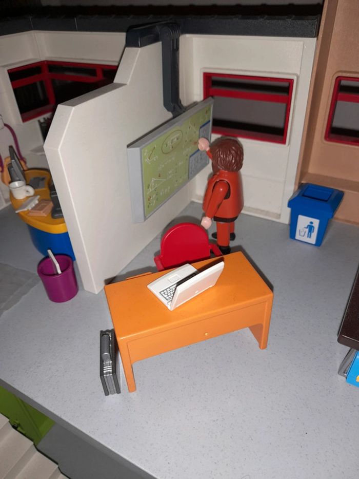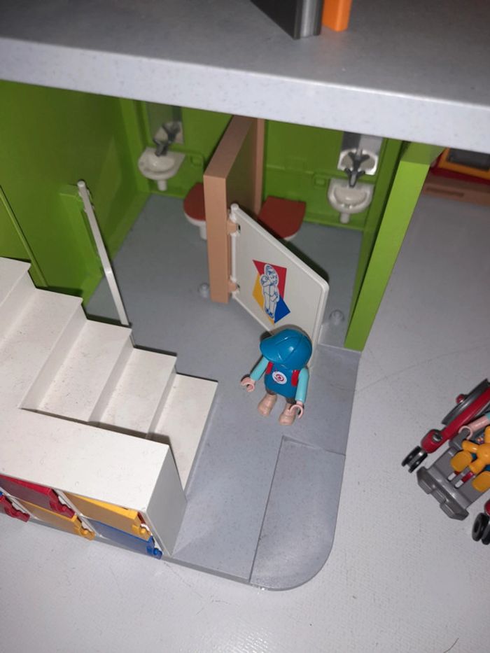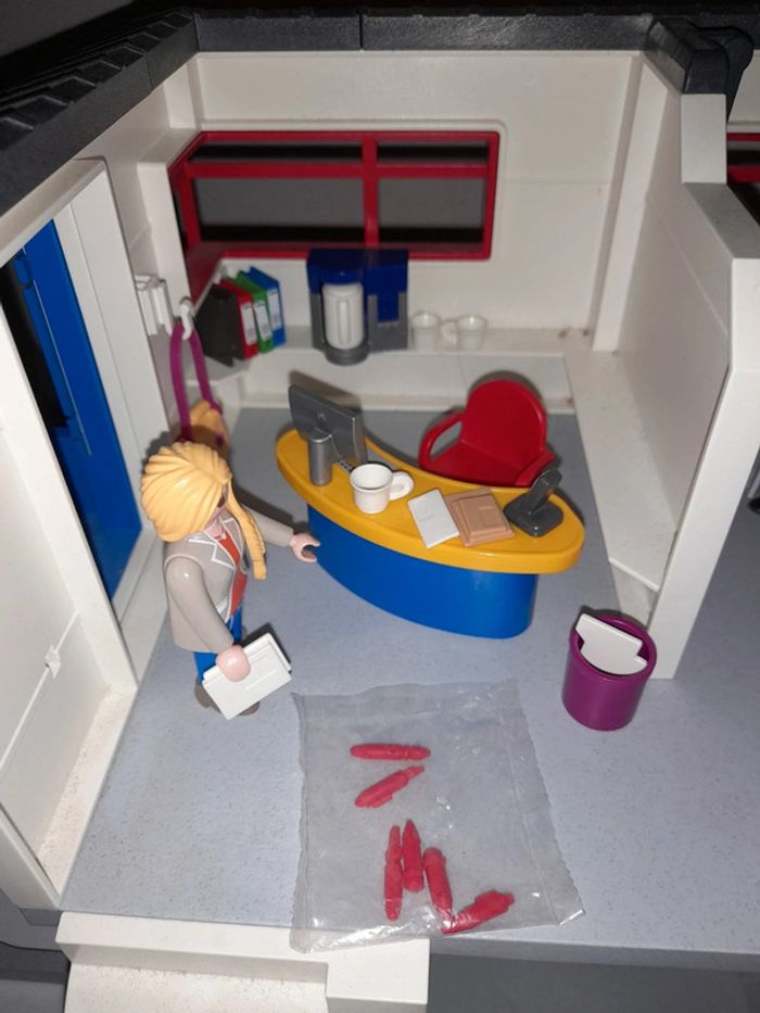 ➡️ Il manque : le squelette et son support, une barquette pour outil, les main-courantes dans les toilettes, une plante en pot, un intercalaire de dossier et un avion en papier.