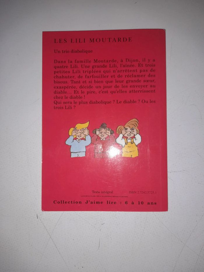 Livre collection j'aime lire de 6 à 10 ans Très bon état Édition de 1993 Dans la famille Moutarde, à Dijon, il y a quatre Lili. Une grande Lili, l'aînée. Et trois petites Lili triplées qui n'arrêtent pas de chahuter, de farfouiller et de réclamer des bisous. Tant et si bien que leur grande soeur exaspérée, décide un jour de les envoyer au diable... Et le pire, c'est qu'elles atterrissent chez le diable ! Qui sera le plus diabolique ? Le diable ? Ou les trois Lili ?