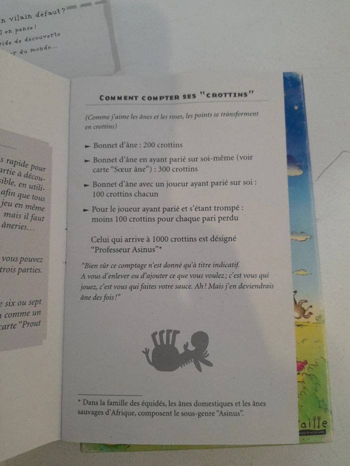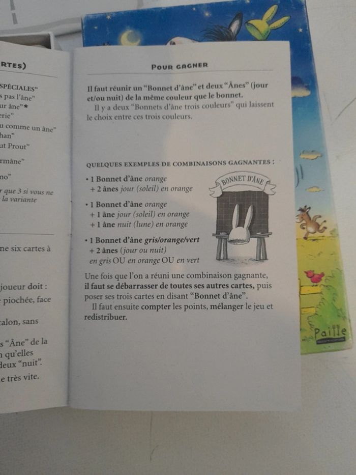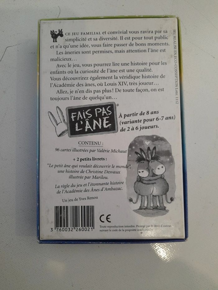 Jeu complet et en très bon état Seule la boîte est légèrement frottée Description du produit Ce jeu familial et convivial vous ravira par sa simplicité et sa diversité. Il est pour tous les publics et n'a qu'un but : vous faire passer de bons moments. Les âneries sont permises mais attention, l'âne est malicieux... Avec le jeu, vous pourrez lire aux enfants une histoire où la curiosité est une qualité. Vous découvrirez également la véridique histoire de l'Académie des Ânes où Louis XIV, très joueur... Editeur : Paille Editions .- Contenu : 95 cartes illustrées, un livre intitulé Le Petit âne qui voulait découvrir le monde, une règle du jeu, l'histoire vraie de l'Académie des Ânes d'Ambazac - Âges : à partir de 8 ans (variante pour les 6-7 ans) - de 2 à 6 joueurs