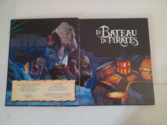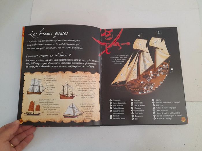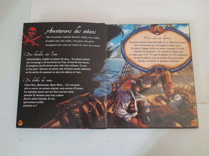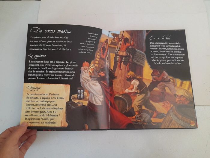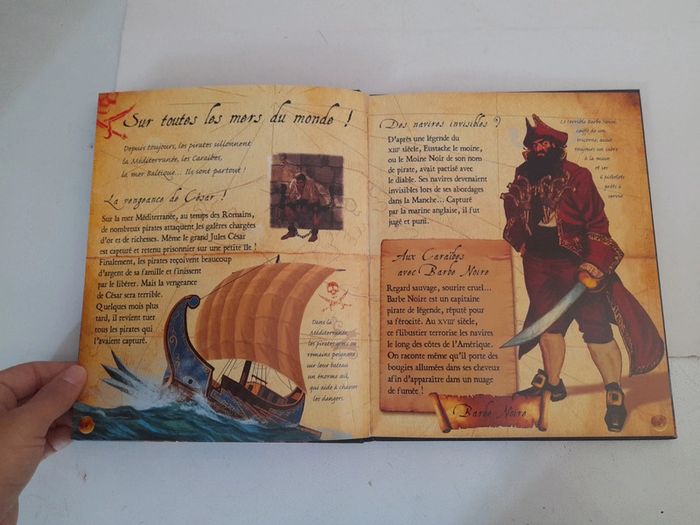 Livre comme neuf Découvre les aventures de Black ou de Nez Cassé, ces terribles pirates qui abordent un bateau espagnol aux cales pleines d'or ! Observe les bateaux qu'ils utilisent et perce les secrets de leur vie trépidante. Tu comprendras ainsi ce qui fait la renommée d'Anne Bonny, de Jack Rackham ou de Long John Silvère, et comment un jour, ils ont pu devenir pirates ! Initialement fourni avec une maquette de bateau à construire qui n'est pas fournie.