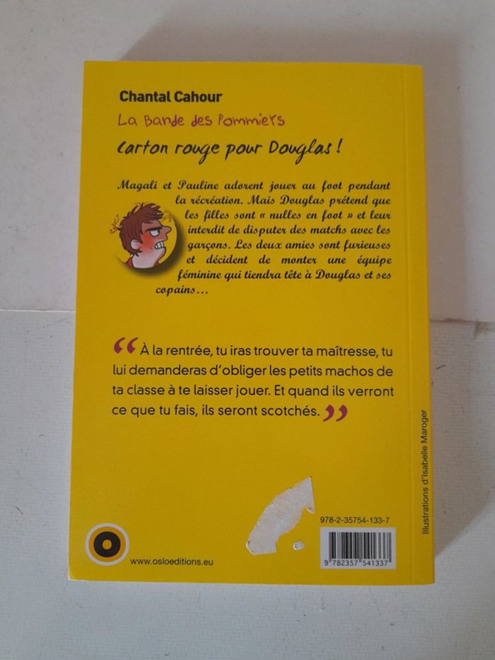 Livre roman Carton rouge pour Douglas Tome 5 de la série La bande des Pommiers Très bon état Magali et Pauline adorent jouer au foot pendant la récréation. Mais Douglas prétend que les filles sont « nulles en foot » et leur interdit de disputer des matchs avec les garçons. Les deux amies sont furieuses et décident de monter une équipe féminine qui tiendra tête à Douglas et ses copains... « À la rentrée, tu iras trouver ta maîtresse, tu lui demanderas d obliger les petits machos de la classe à te laisser jouer. Et quand ils verront ce que tu fais, ils seront scotchés. »