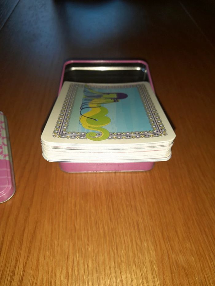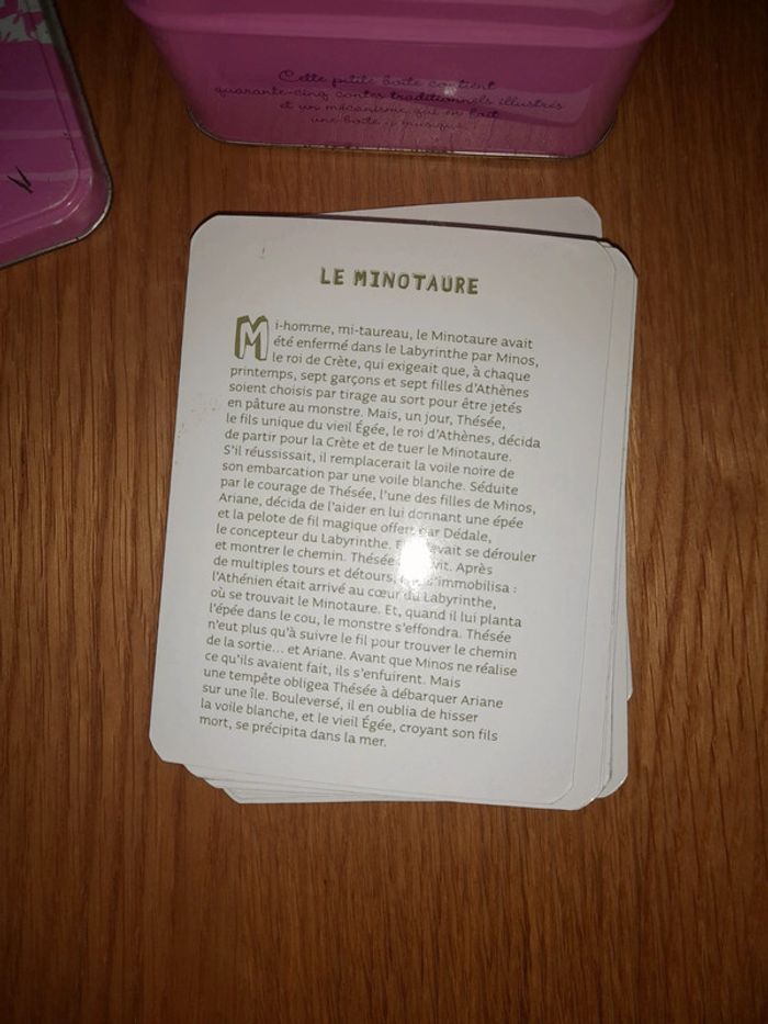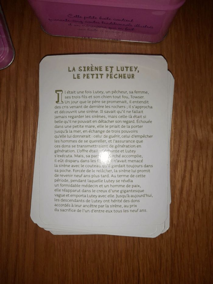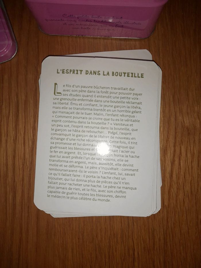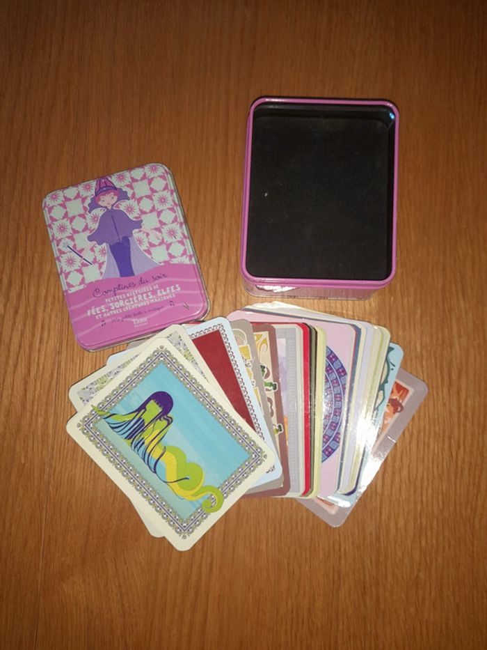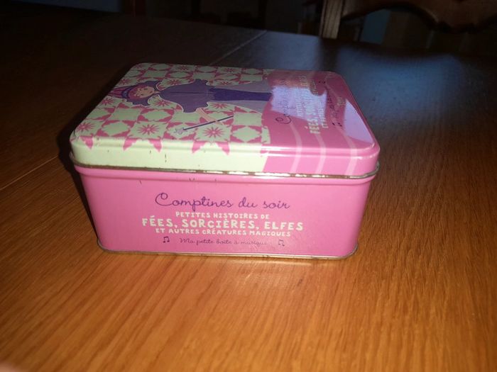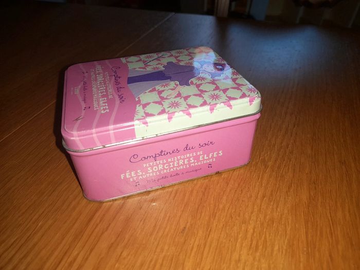 Petites histoires de fées, sorcières, elfes et autres créatures magiques. Boîte à musique avec 29 fiches histoires Une histoire par fiche Musique : quand on prie la bonne étoile. Boîte en état moyen, quelques traces de rouilles sur les bords (voir photos) Fiches en bon état, certaines 3-4 ont des traces de pliures.