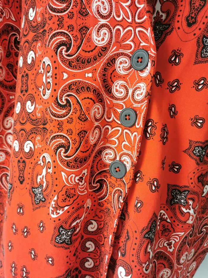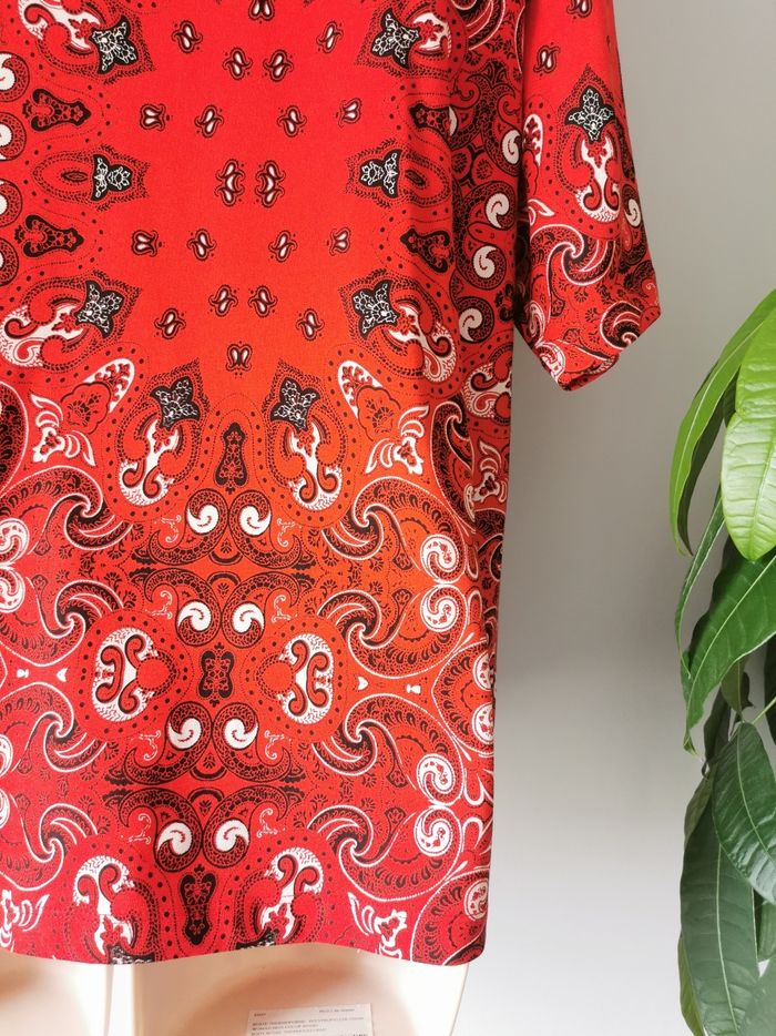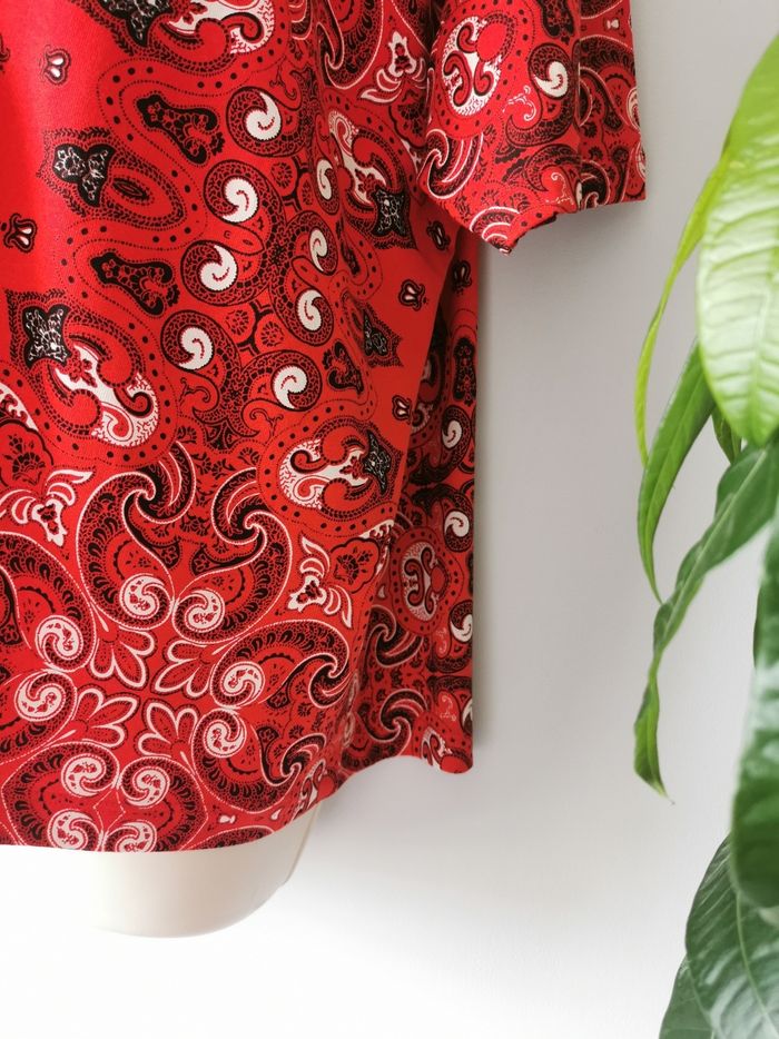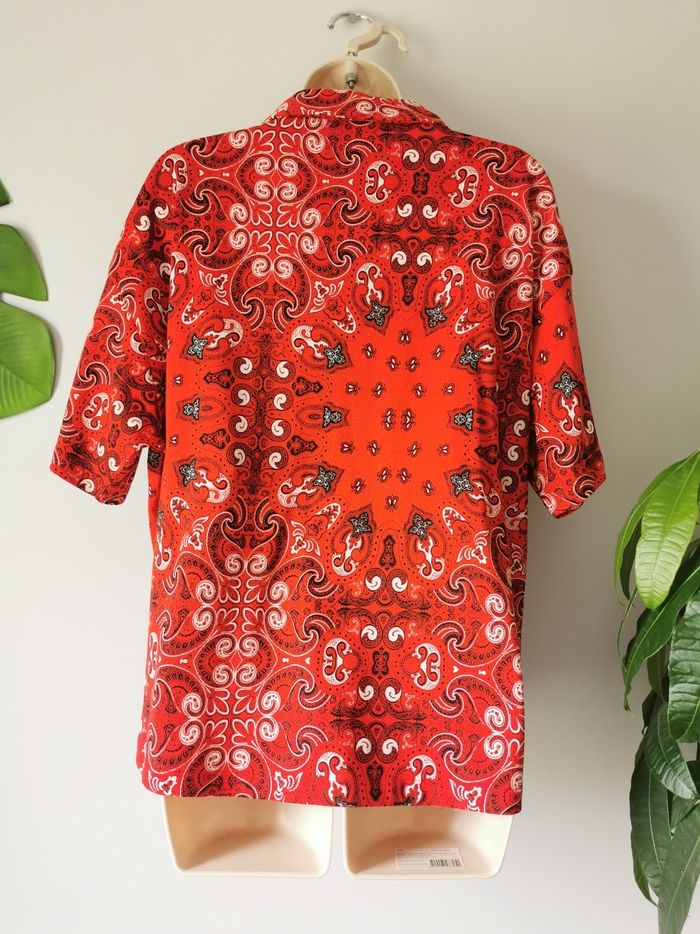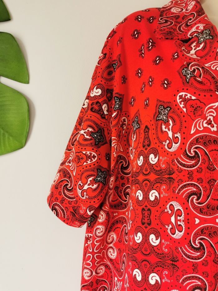 🙎‍♀️ ÉTAT DE L'ARTICLE: 10/10 ✅️ Sans étiquette, jamais portée 📷 Photos portées du site disponibles en message privé 📷 Chemise oversize 👩 Asos Design Taille 42 • Matière: 100% coton • Coupe oversize • Col chemise 👚 • Manches courtes • Fermeture par 3 boutons ⚫⚫⚫ à l'avant • Imprimé effet bandana motifs Paisley • Couleur: Rouge 🔴 • 📏 Longueur: 65 cm • 📏 Mesure épaules: 58 cm • 📏 Mesure sous aisselles: 61 cm 💰Prix boutique: 27.99€ Parfait état👌, jamais portée 🔵🔵