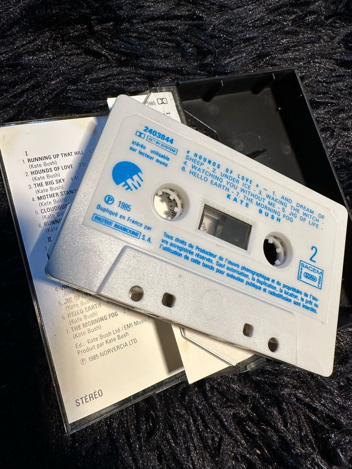 Bonjour Je propose à la vente cette très rare cassette originale Kate bush : Hounds of love . Et notamment pour les fans de strangers things la chanson culte de la série : Running Up That Hill Très rare et en superbe état . Tout d’origine .