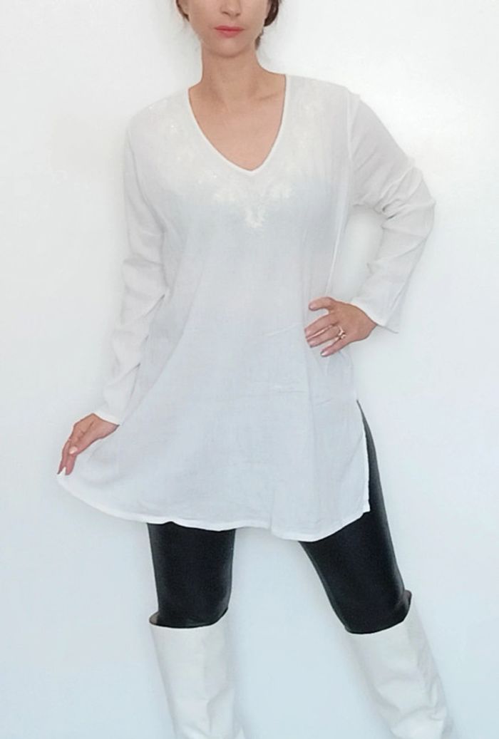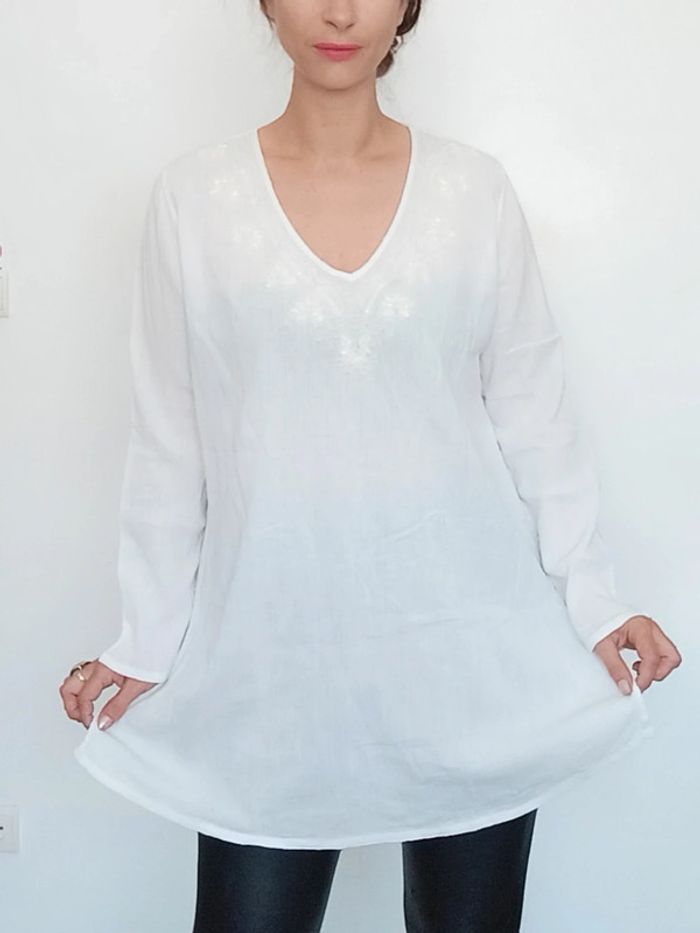 📣 Pour un lot, me contacter 😊🌸 -10% pour deux articles achetés -20% pour trois et + 🥰 #poupoupidoutu 🫶🫶🫶🫶🫶🫶🫶 Tunique blanche brodée casual, style romantique, confortable, unie blanche facile a porter et a assortir, fendue en bas côtés, manche longue, col en V, convient toutes tailles #tunique #tuniqueblanche #tuniquecoton #tuniquebrodee #tuniqueromantique #tuniquecasual #tuniqueethniquechic #tuniqueete