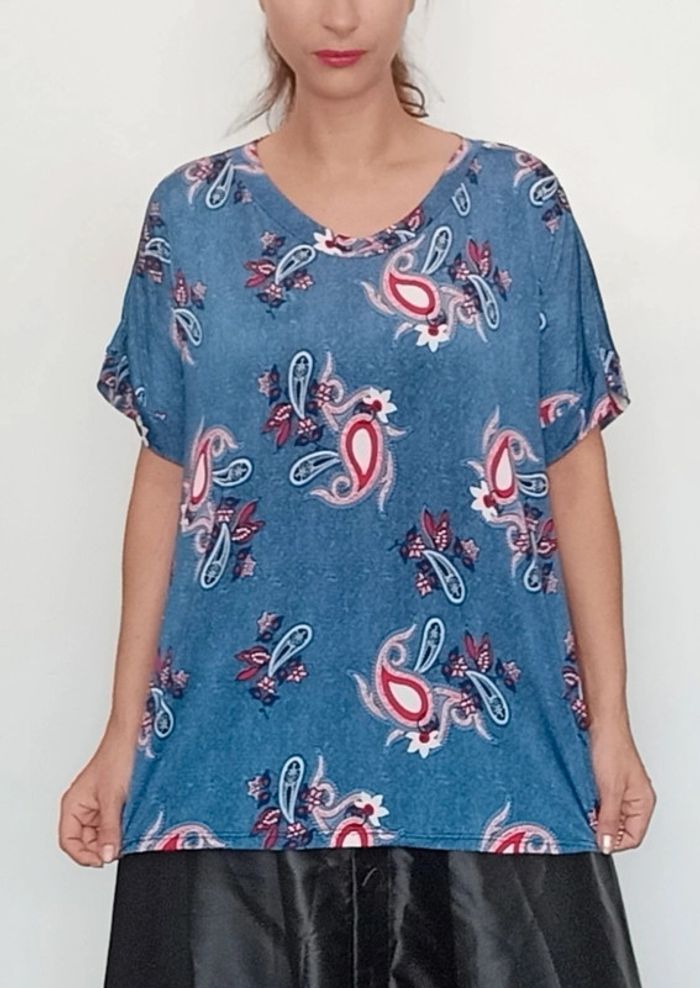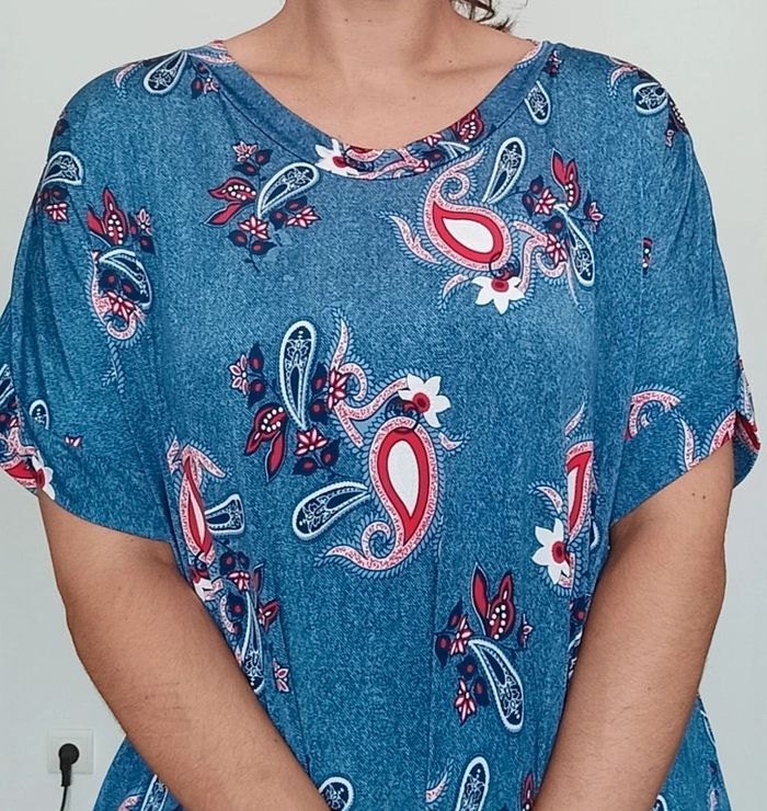 📣 Pour un lot, me contacter 😊🌸 -10% pour deux articles achetés -20% pour trois et + 🥰 #poupoupidou52 🫶🫶🫶🫶🫶🫶🫶 T-shirt manches courtes doux et fluide, bleu motif rétro style bandana, confortable et facile a assortir, 71 CMS de couture aisselle a couture aisselle #tshirtgrandetaille #tshirtretro52 #tshirt52 #haut52 #hautfluide52 #hautete52 #hautdoux52 #hautretro52 #hautgrandetaille #hautetegrandetaille #tshirtbandana #tshirt6xl #haut6xl
