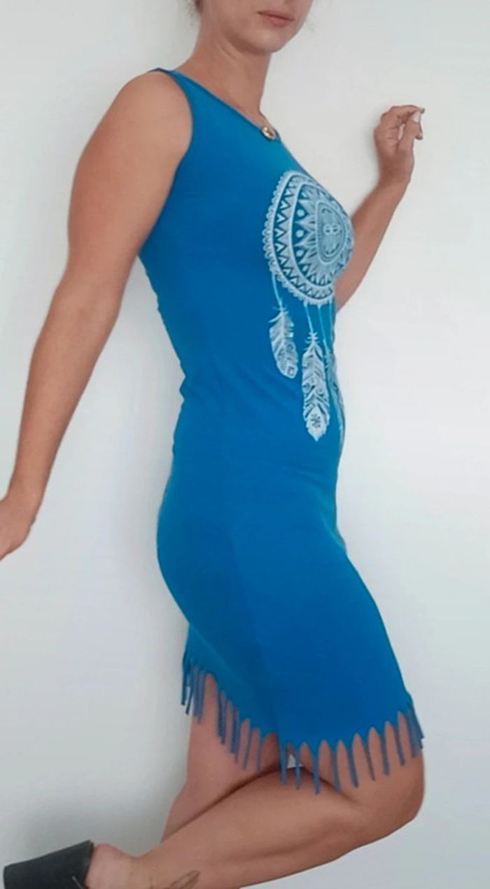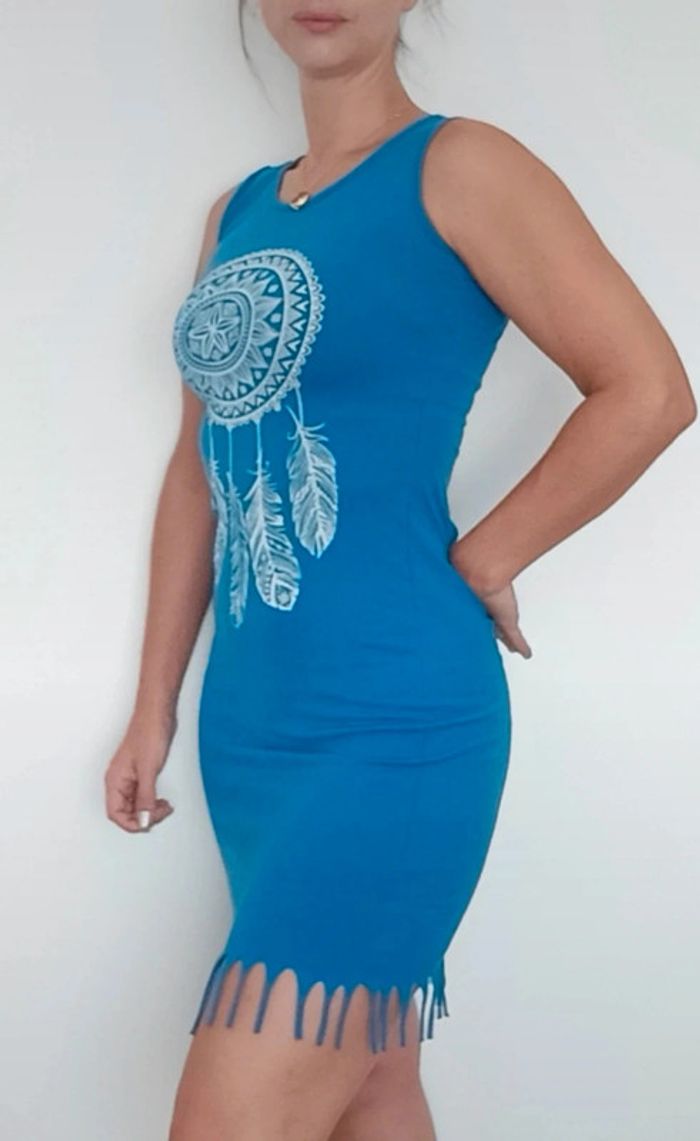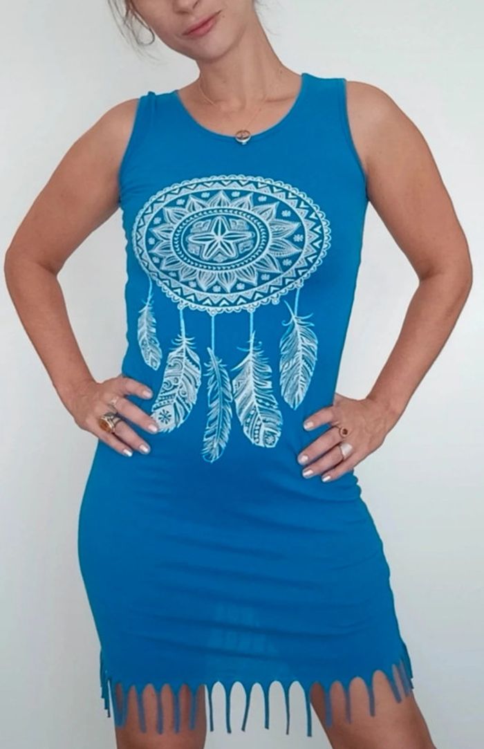 📣 Pour un lot, me contacter 😊🌸 -10% pour deux articles achetés -20% pour trois et + 🥰 #poupoupidou36 🫶🫶🫶🫶🫶🫶🫶 Robe courte bleu matière t-shirt, confortable et féminine, motif attrape rêve, et frangée en bas #robefranges36 #robefrangee36 #robetendance36 #robeete36 #robemoulante36 #ribetshirt36 #robecasual36 #robesexy36