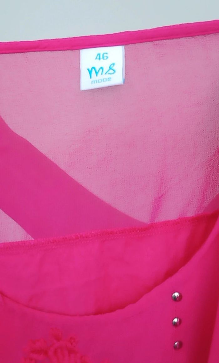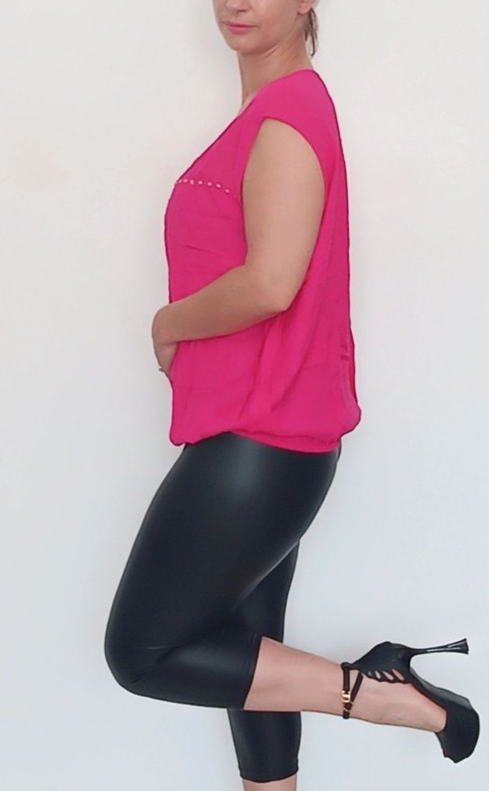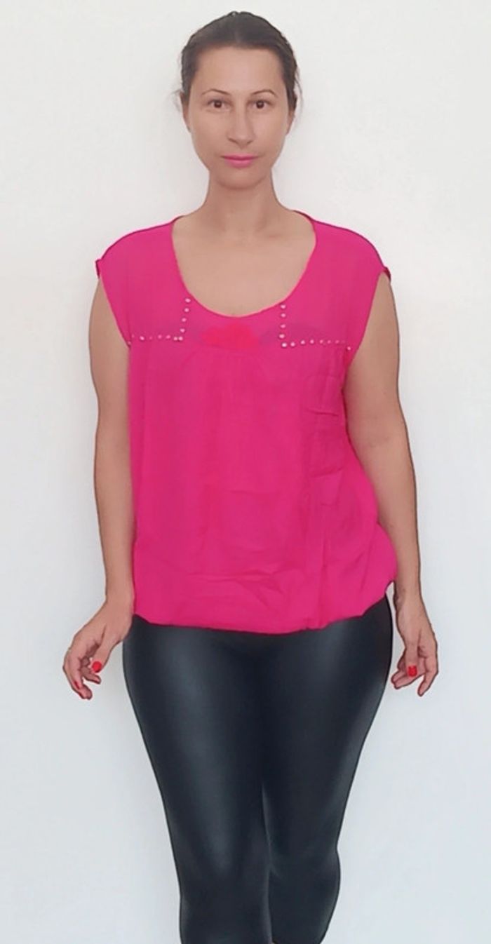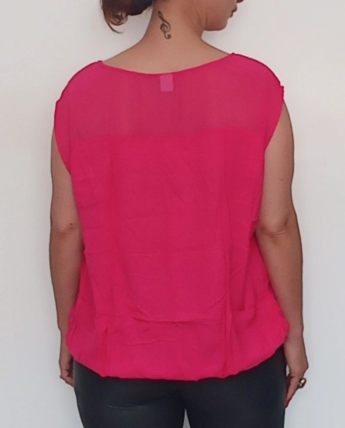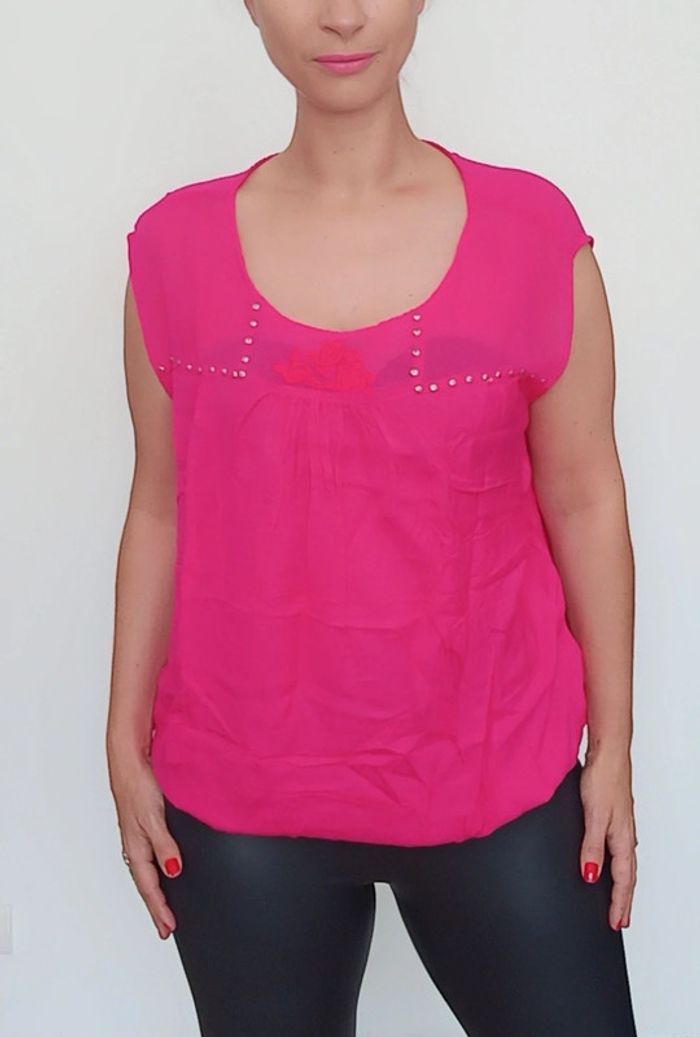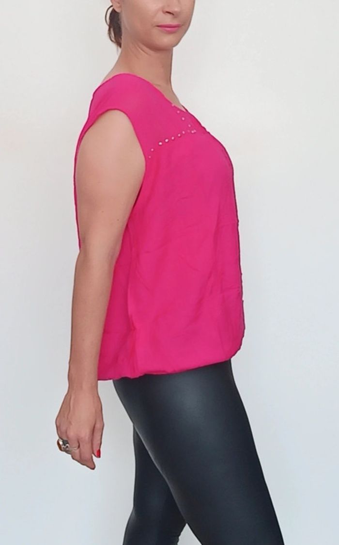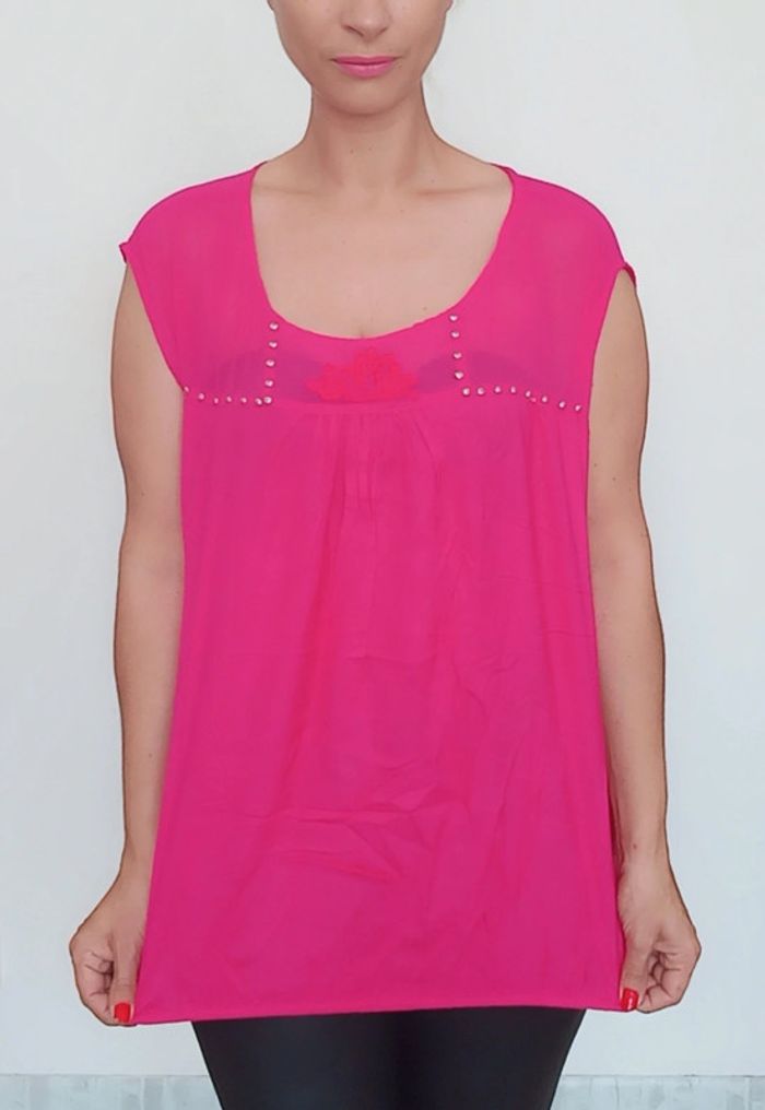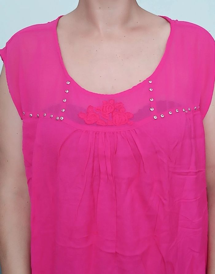 Blouse d'été sans manches unie framboise, légèrement voile, avec broderies, reliefs et clouté argenté au buste, facile a porter et a assortir, légère et féminine #blouse46 #blouseete46 #blouseframboise