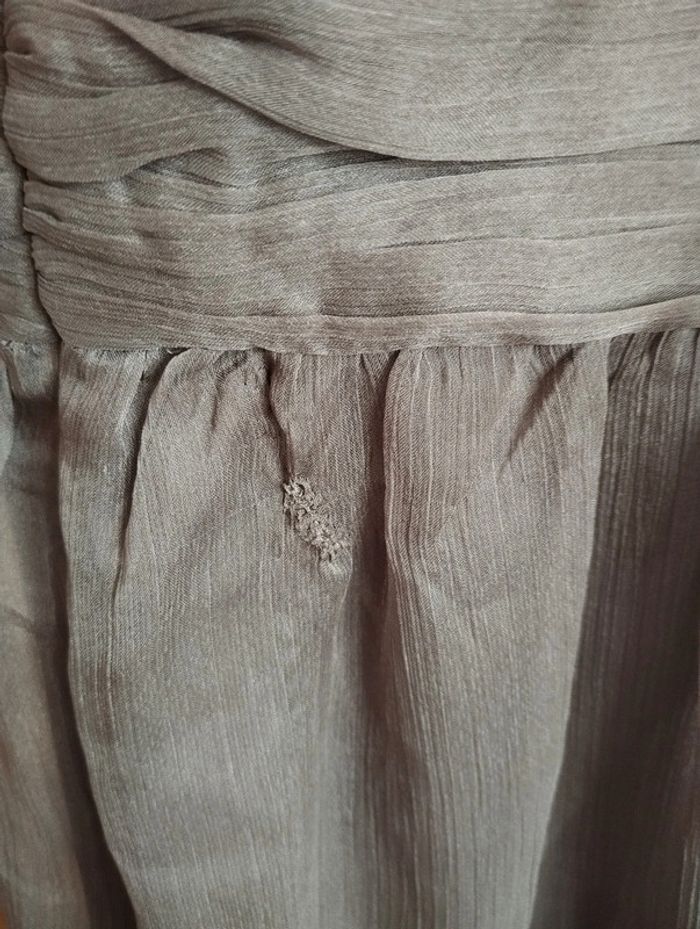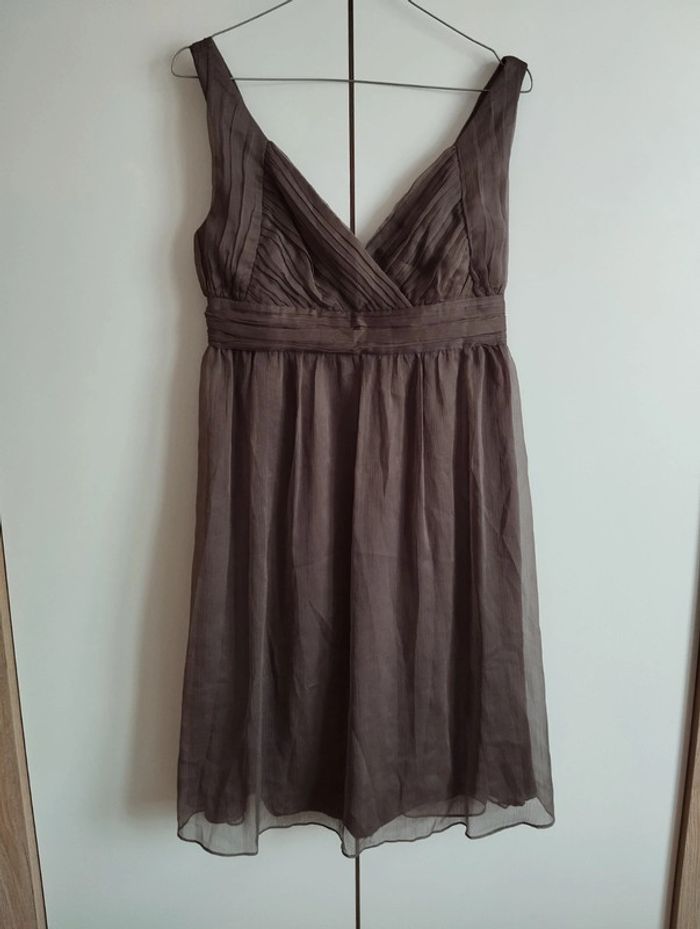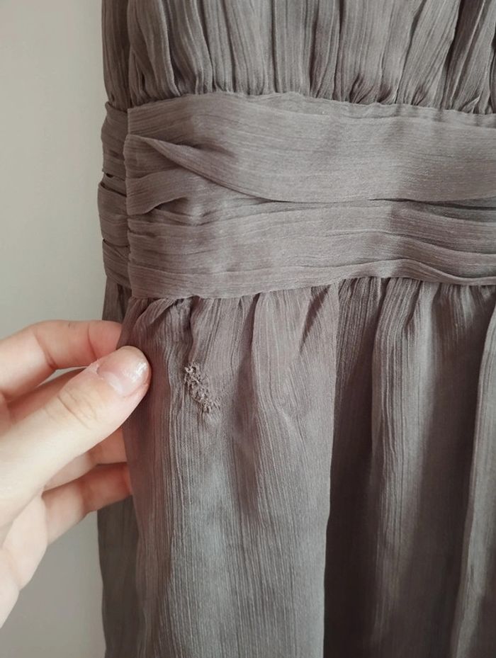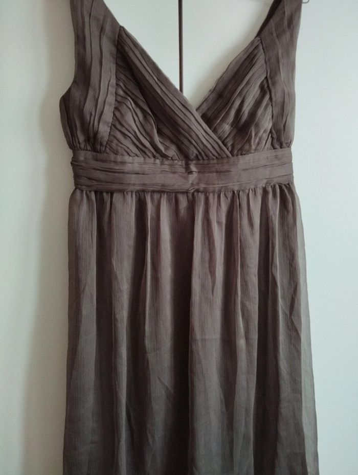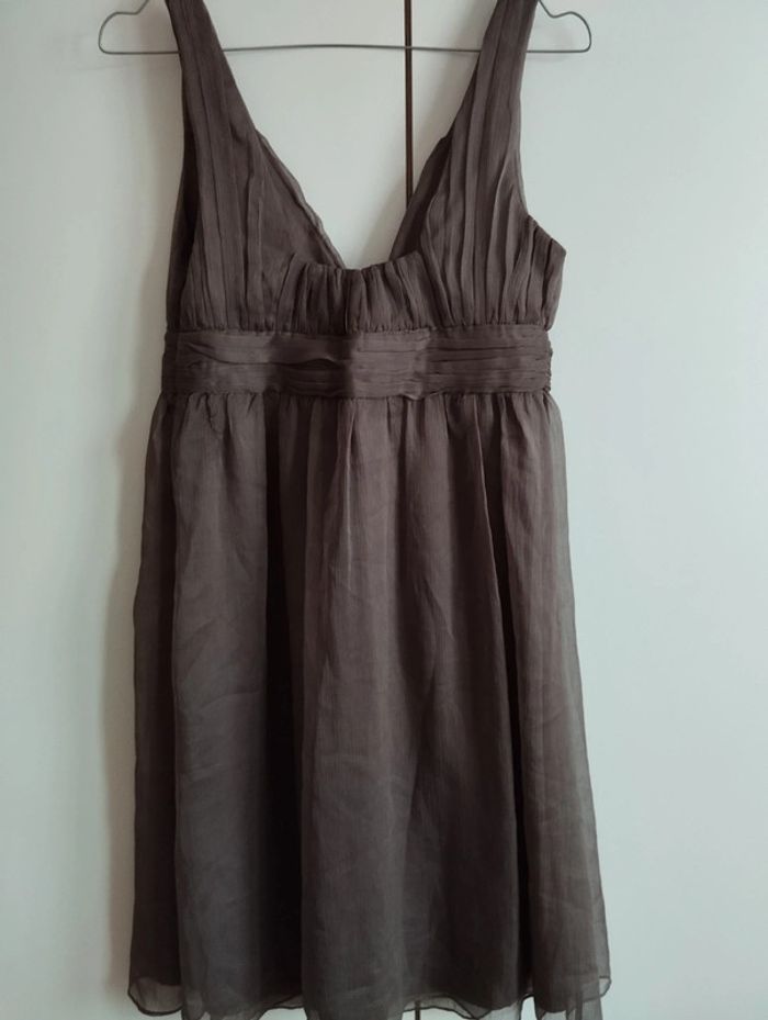 Robe Naf Naf En voilage couleur taupe (voilage doublé donc non transparente). Dans le dos sous la ceinture il y a un accroc qui a été recousue. La robe était "drapé" cela ne se voit pas porté. Le prix a été réajusté en conséquence ! Le reste est en très bon état ! #Femme38etoile67100