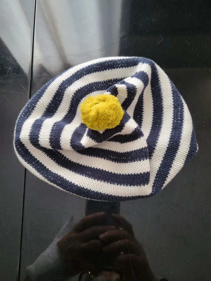 Bonnet forme boule raye marine ecru pompom vert anis bordure raye anis sur le bas