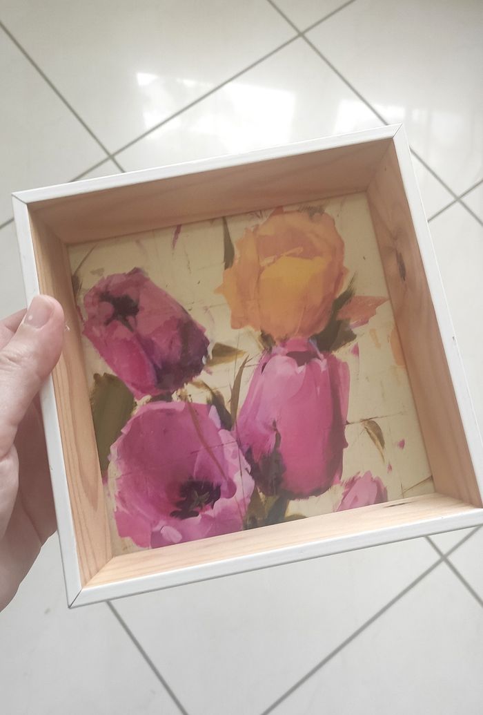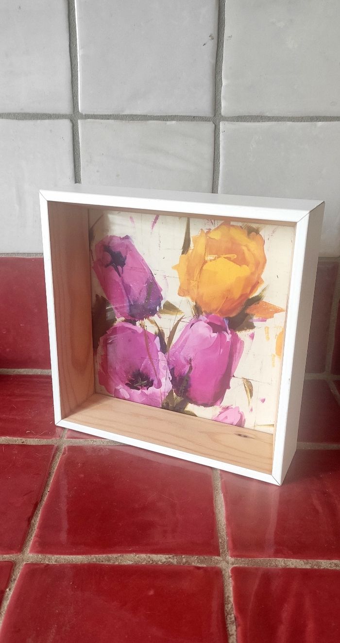 Joli petit tableau en bois représentant des fleurs, effet de profondeur. À poser ou à accrocher.