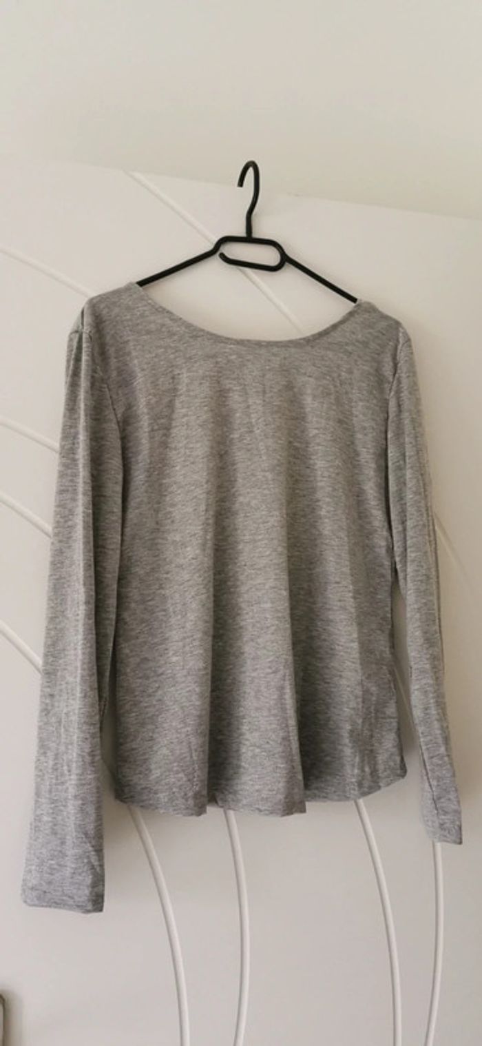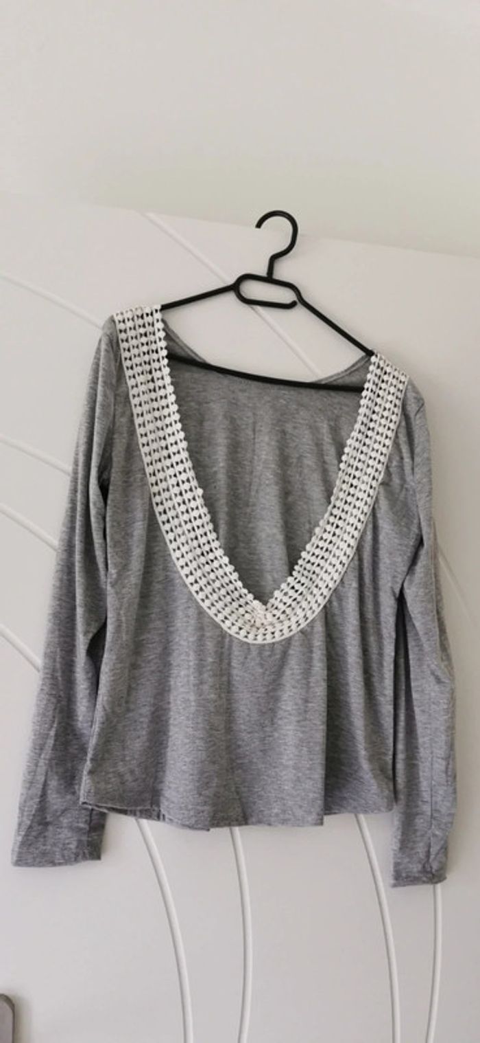Haut gris, décolleté dans le dos avec "broderie"