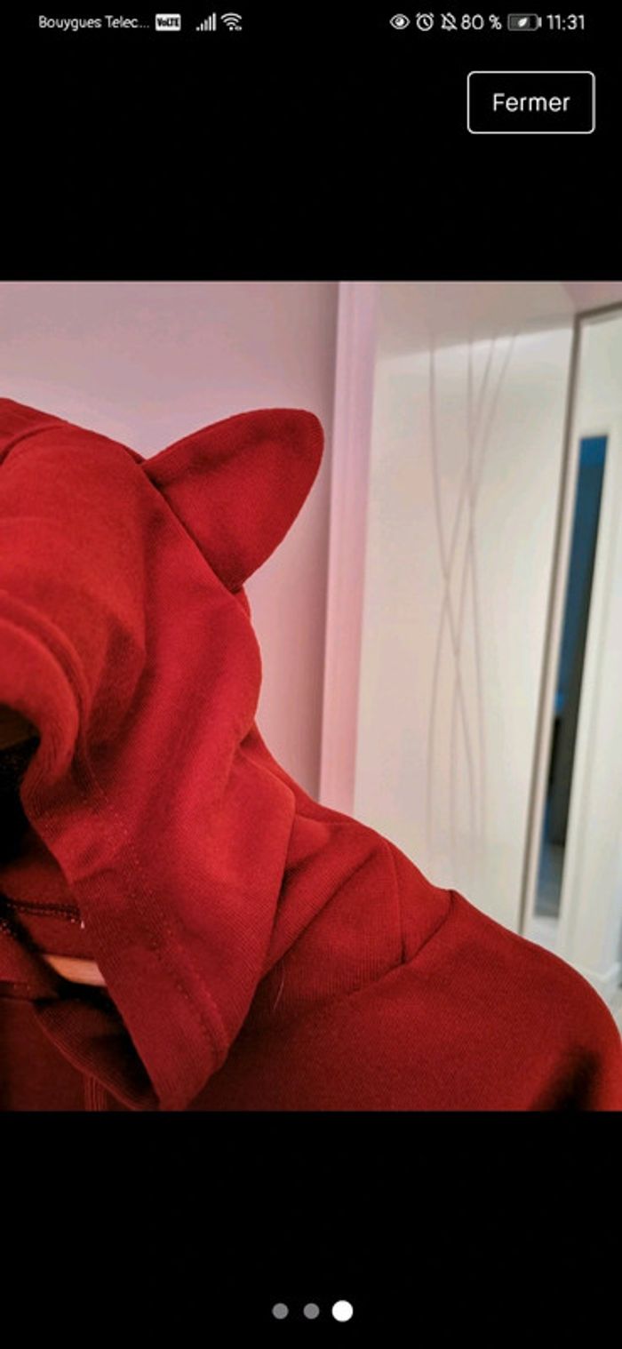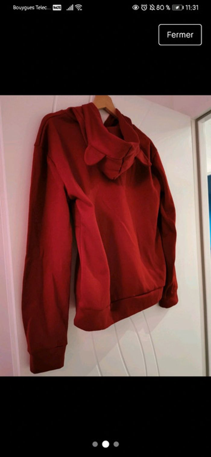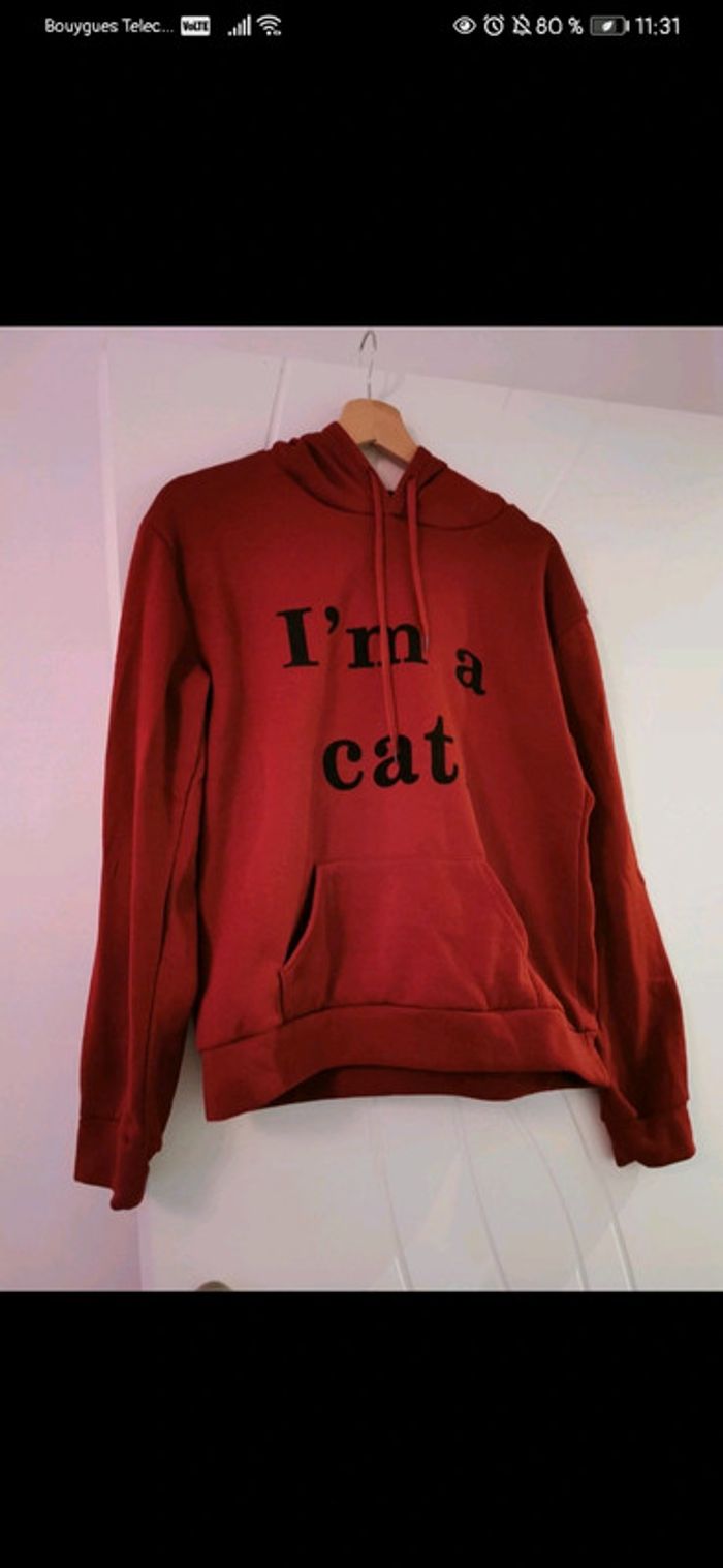 Sweat imprimé "I'm a cat", avec une poche et une capuche avec des oreilles de chat. Matière agréable mais moyennement épaisse, il ne s'agit pas d'un sweat chaud. Je ne l'ai jamais porté car il me serre. Taille XL sur l'étiquette mais taille plutôt L, donc je le mets en vente en tant que L.
