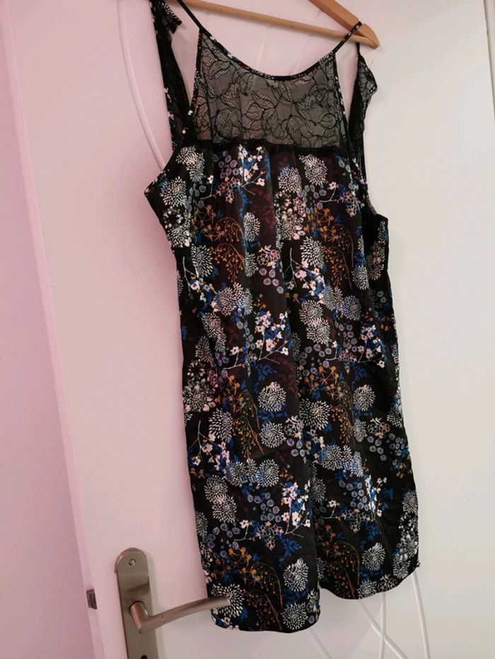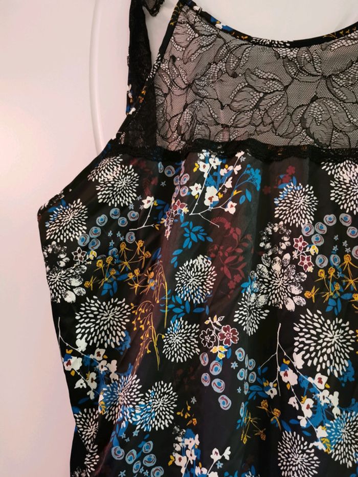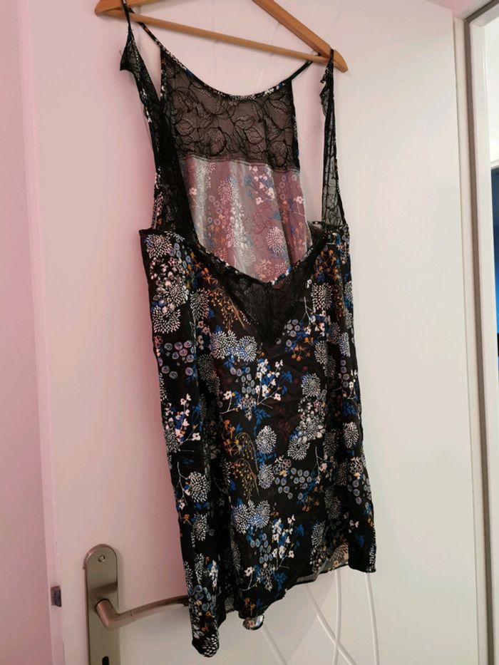 Jolie nuisette, jamais portée. Motif fleuri et dentelle noire, dos "nu". Marque Mosquitos. Taille L