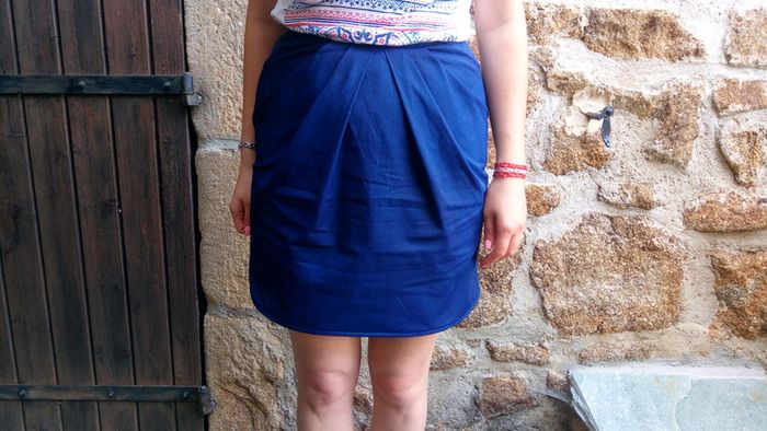 Mini jupe, avec poche dans le pli du haut. Elle se ferme par une fermeture éclair invisible. Elle ne me va plus. Couleur bleu avec des effets délavé à des endroits. Une texture un peu parachute. Fait main Taille petit.