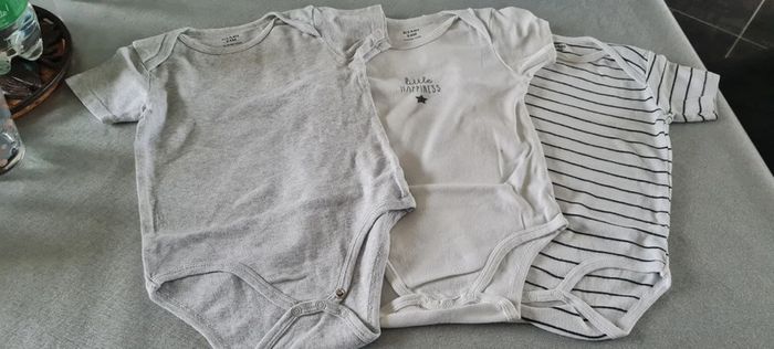 En bon état , le blanc est taché à l entrejambe et le rayé au col Le gris est en très bon état #amvanessagarcon24mois