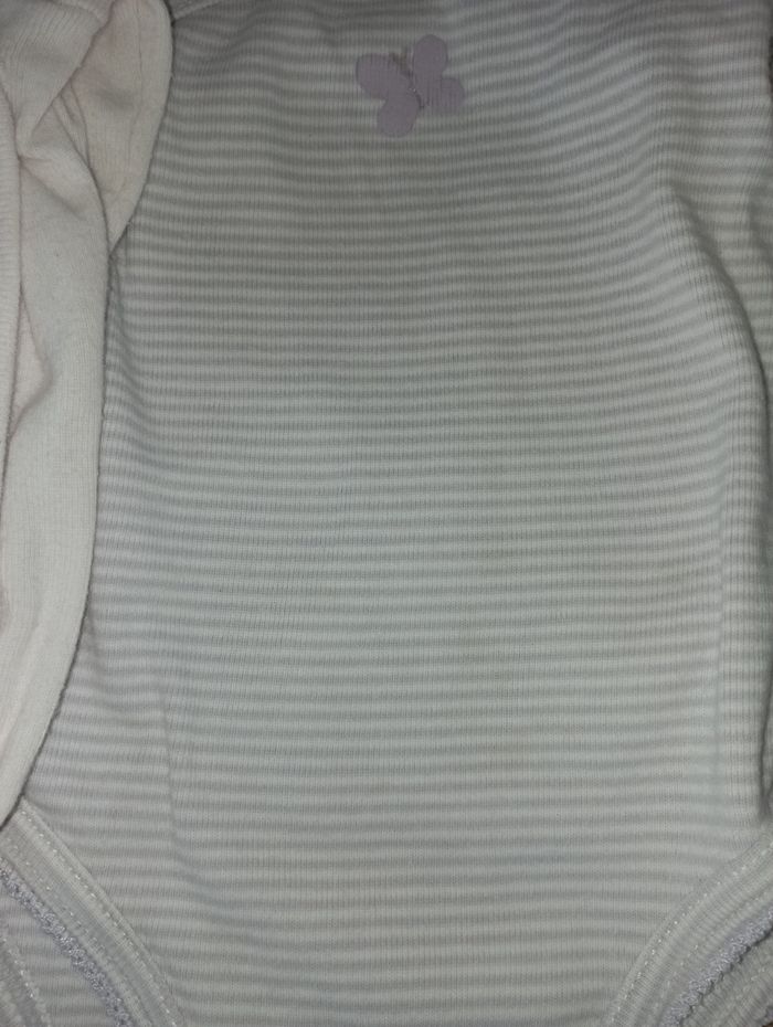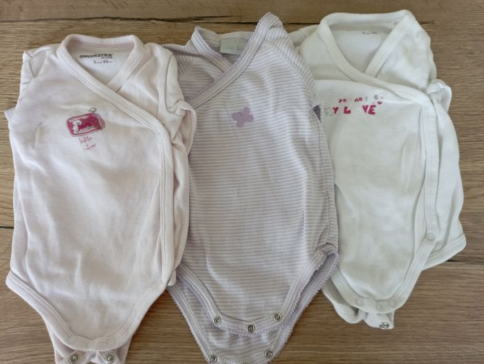 Lot bodys manches longues taille 3 mois en bon état 2 orchestra légèrement jaunies au niveau du col 1 Kiabi avec de légères tâches au niveau du ventre voir dernière photo