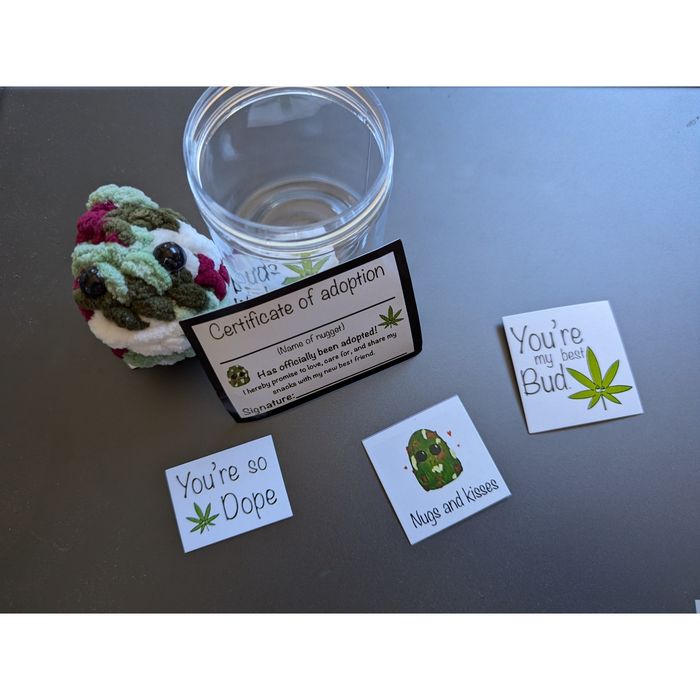 Petit peluche en forme de weed avec son bocal et son certificat d'adoption 🌱🫙📋 Sympa comme déco ou pour offrir