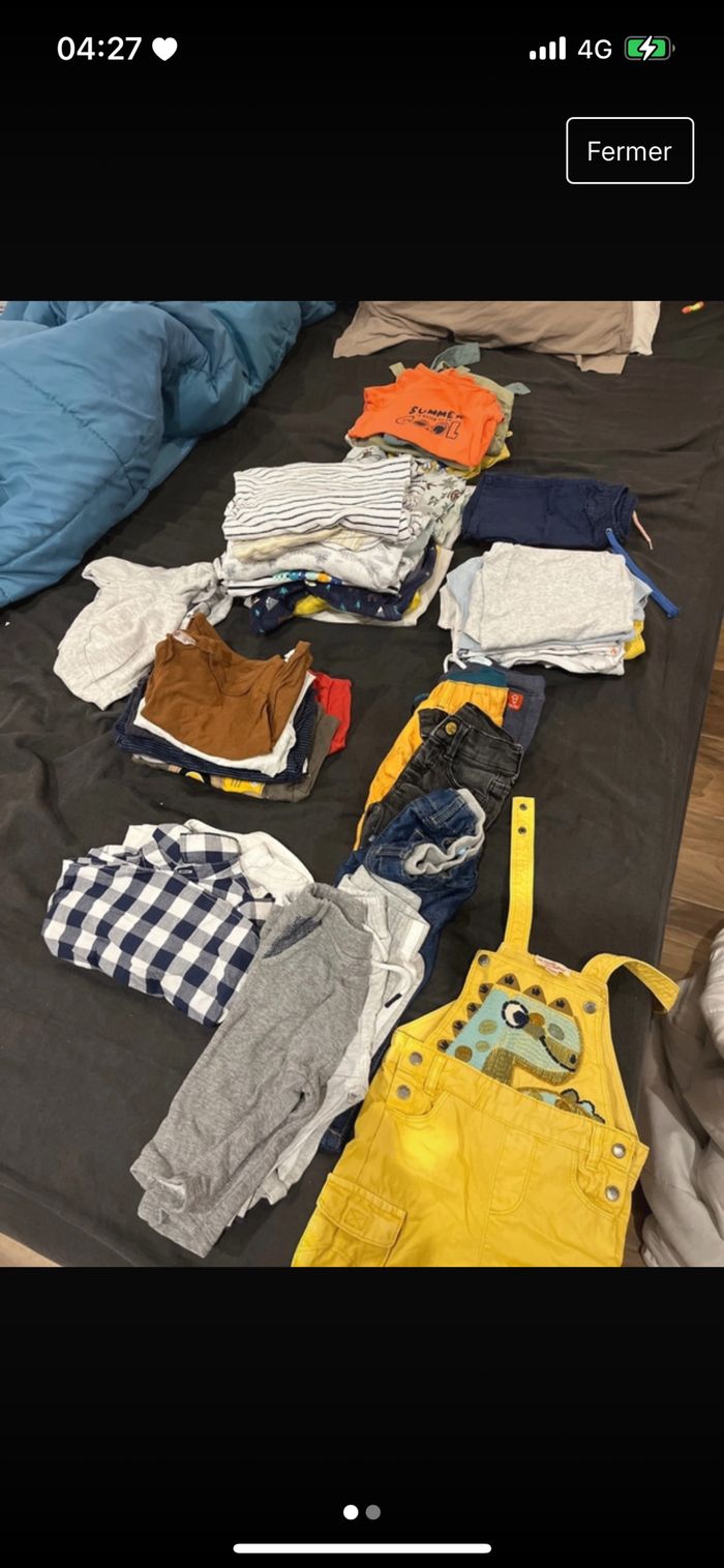 Lot 6 mois : 1 salopette 2 chemises 7 pantalons 9 maillots manche longues 1 veste 7 pyjamas + 1 pantalon de pyjama 9 bodies 3 short 5 combi short 3 maillots manche courtes Quelques articles en bon état sinon tout est tbe Plusieurs marques 15€ le tout
