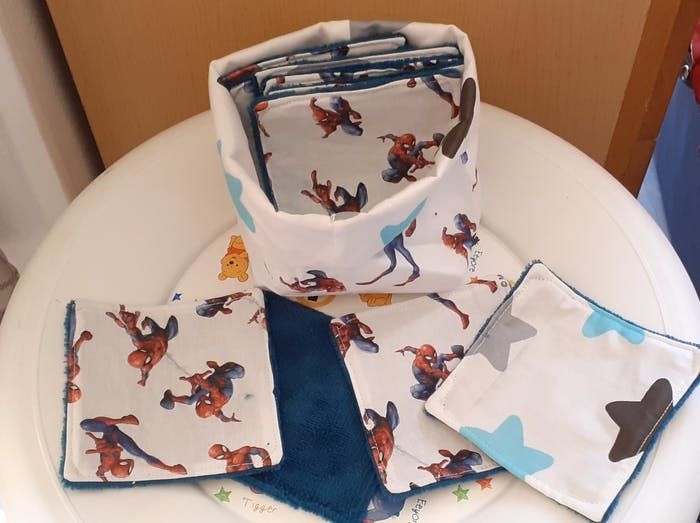 5 lingettes étoiles 🌟 5 lingettes spiderman 100% éponges bambou Oeko tex Et son petit panier de rangement en coton