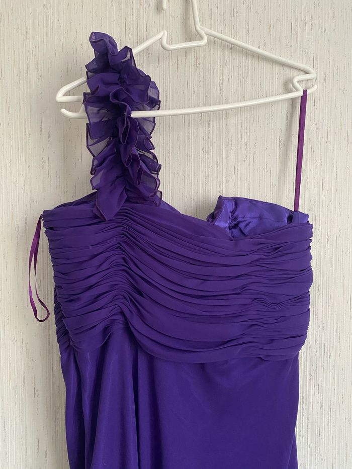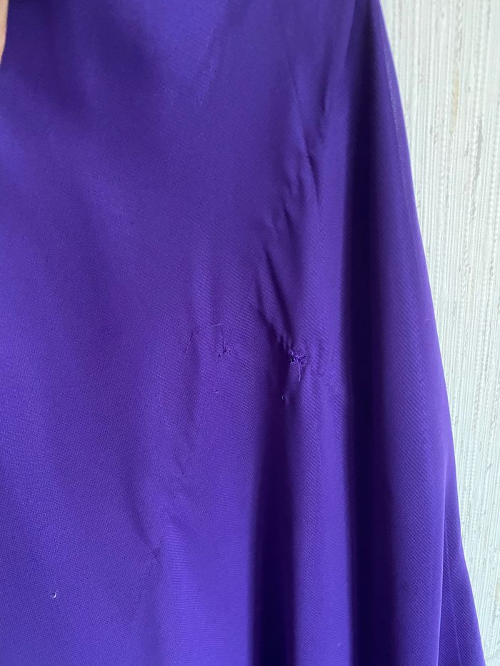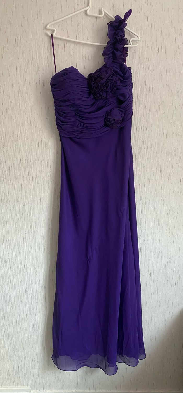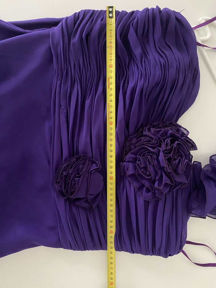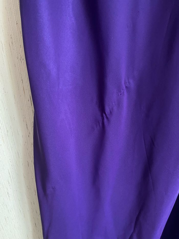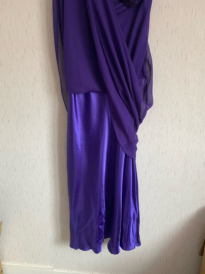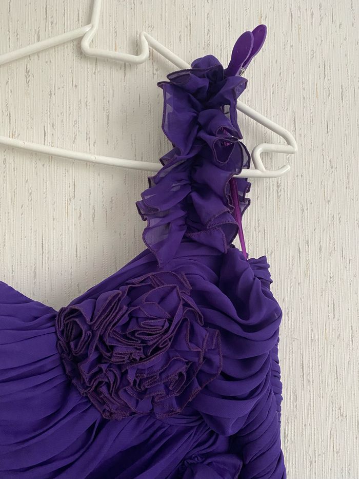 Robe longue de soirée de couleur violette, elle se porte avec une seule bretelle avec des frous-frous. Elle possède deux belles fleurs sur la poitrine. Il y a une fermeture éclair qui fonctionne très bien sur le côté gauche de la robe, rembourrage au niveau de la poitrine. Elle a une belle doublure en satin en dessous de la robe. Possède plusieurs accros sur le devant de la robe à différents endroits, voir les dernières photos, mais elle reste en très bon état. Dimensions : (voir photos) Poitrine : 44cm Longueur : 145cm Si vous souhaitez plus de renseignements n’hésitez pas à m’envoyer un message 🙂