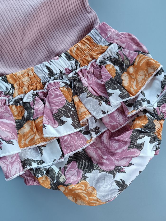 Ensemble bloomer fleuri à volants derrière, body vieux rose à volants et fleur poitrine, bandeau cheveux gros noeud