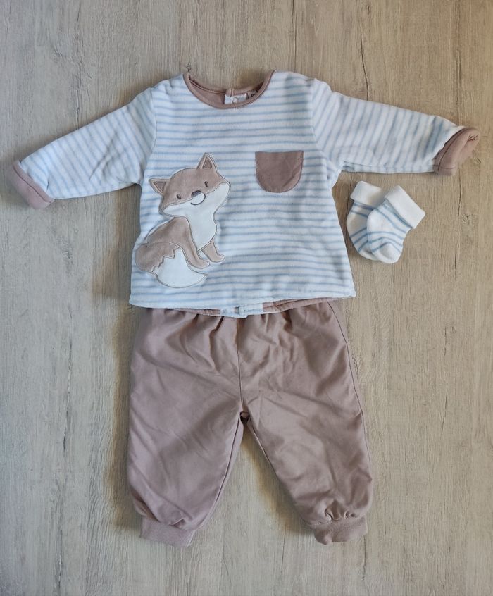 Ensemble de pyjama avec chaussettes, porté une seule fois, comme neuf. Très chaud pour l'hiver. Taille 6 mois.