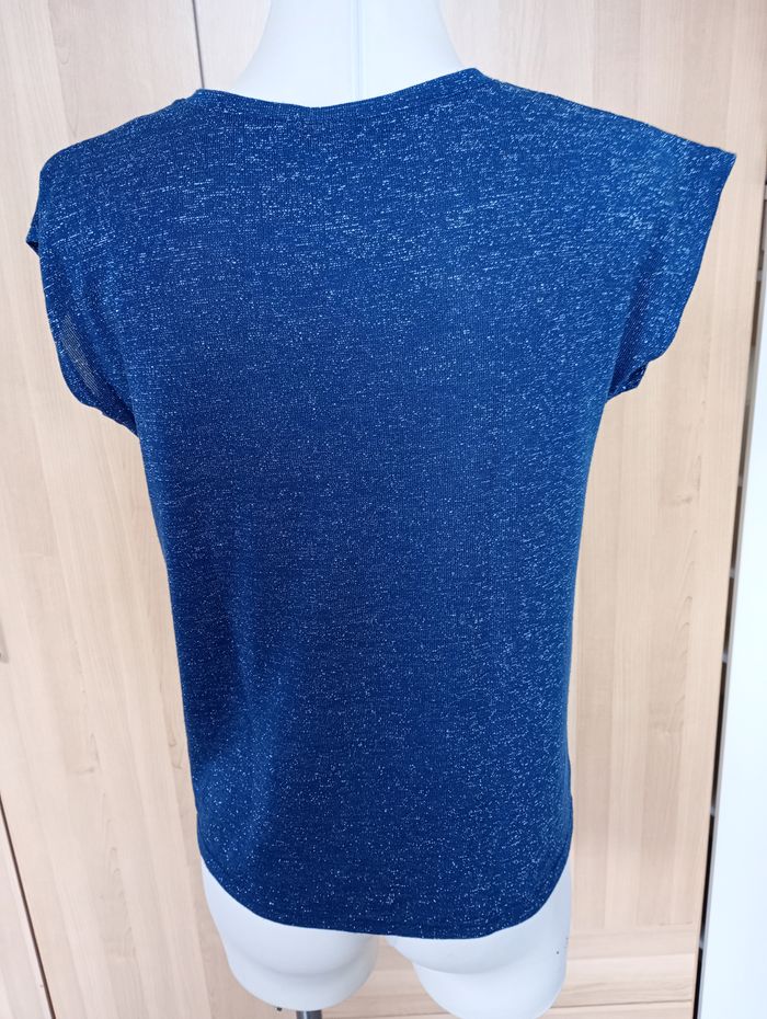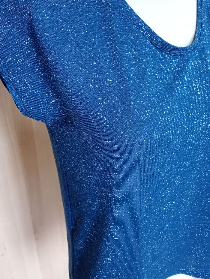T-shirt pailleté bleu pétrole (moins bleu que sur les photos). Marque : TQF Collection. Taille S : Les mesures : Longueur : 60 cm. Largeur entre aisselles : 46 cm. Très bon état.