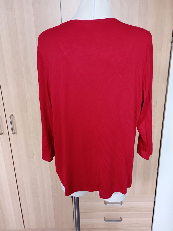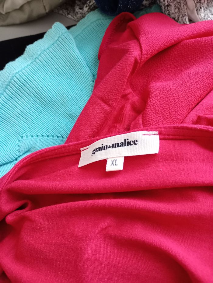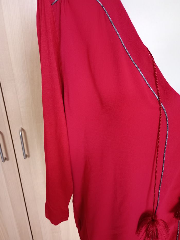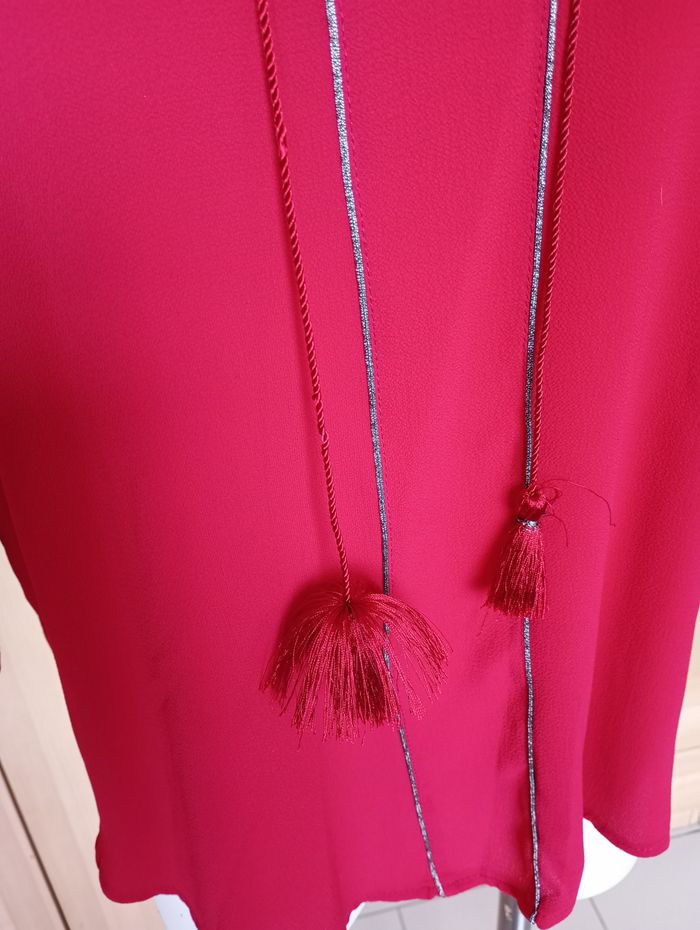 Blouse rouge en bi-matière. Voile sur le devant et matière "t-shirt" pour le reste. Elle est en très bon état mais l'attache d'un des cordons est partie. Liseré argenté sur le devant. Marque : Grain de Malice. Taille : XL Longueur : 64 cm. Largeur : 56 cm. Longueur manches : 48 cm.