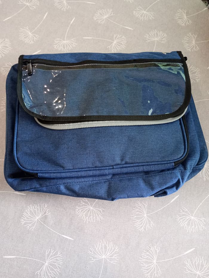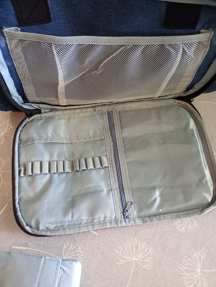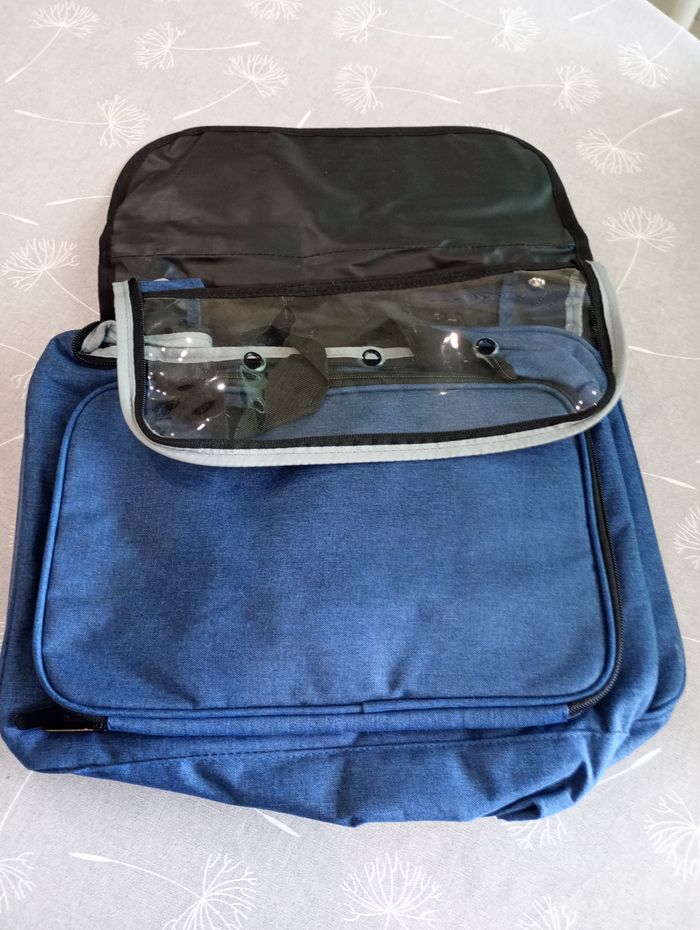 Sac pour contenir tout votre nécessaire à tricot. Il contient de nombreuses poches, un plastique pour séparer vos fils, une bandoulière pour le transport, des rangements pour vos aiguilles... Très bon qualité, couleur bleu-gris. Dimensions ouvert : 38 x 27 x 18 cm.