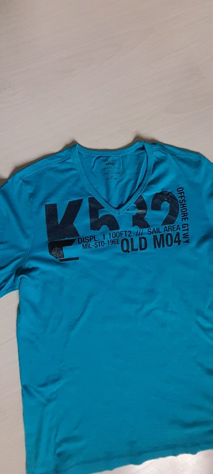 Tee-shirt taille M Marque CELIO Couleur bleu turquoise avec motifs sur devant 100 % coton Très très bon état