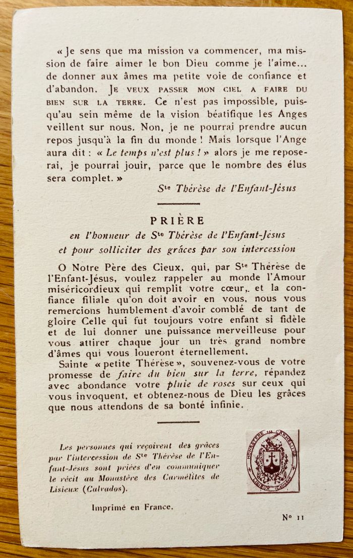 Image pieuse ancienne de Sainte Thérèse avec étoffe et prière
