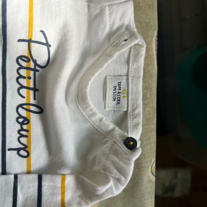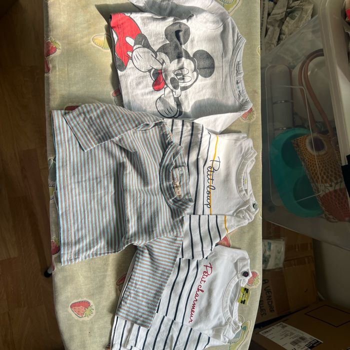 Jolie lot de 4 teeshirt manche longue pour bébé garçons en taille 1 mois. Les teeshirt ont été porter quelques fois il sont en très bon état. Il y a plusieurs marque : - 1 Disney baby - 2 Tape à l’œil - 1 grain de blé