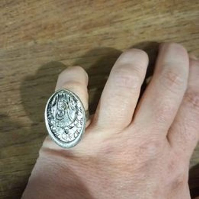 Bague réglable pour femme Forme ovales avec strass Matières métal et strass Couleurs argenté et gris Taille ajustable Dimensions 3cm de long et 2cm de large En très bon état