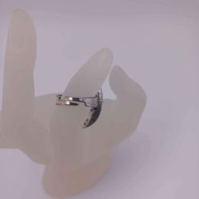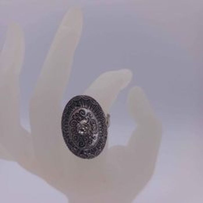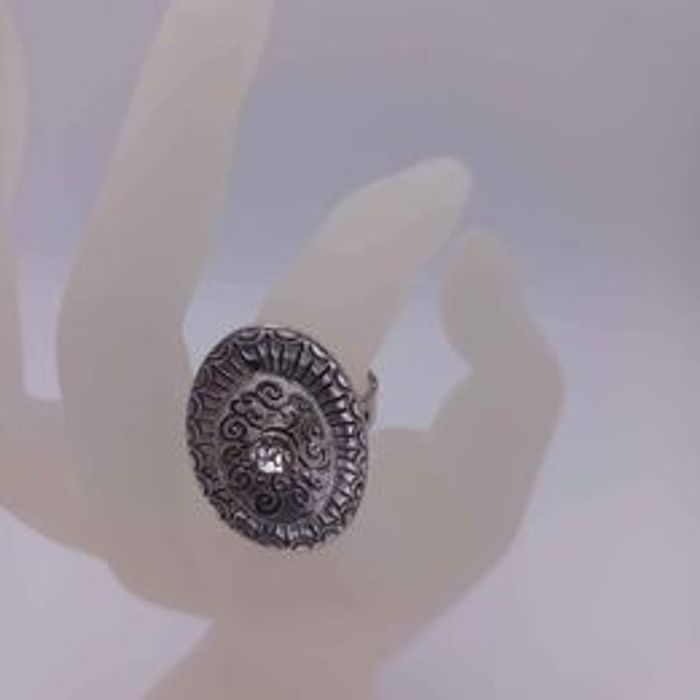Bague réglable pour femme Forme ovale motifs striés Matières métal et strass Couleurs argenté et gris Taille ajustable Dimensions 3cm de long et 2cm de large En très bon état