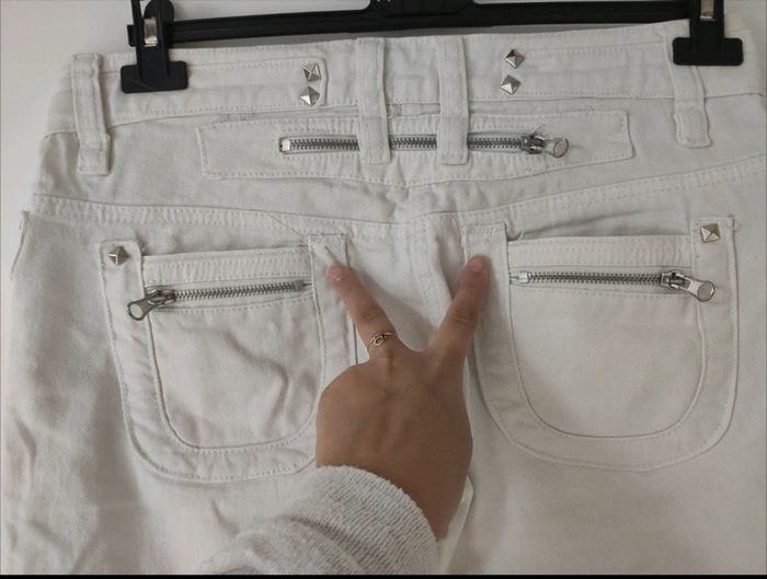 Blanc / Écru. En très bon état, il manque juste quelques 'clous carrés' de décoration (sur les poches des fesses et sur un côté) voir photo 4 et 5. Mais on n'y fait pas attention Grosses réductions sur les lots et beaucoup d'articles dans mon dressing ! Profitez en ! 🤗😉 Dressing trié par taille -> #miladys40 Pour les autres tailles: voir la liste dans la description de mon profil, visitez mon dressing ou demandez moi 😉 #pantacourt #denim #jeans #blanc #ecru C1