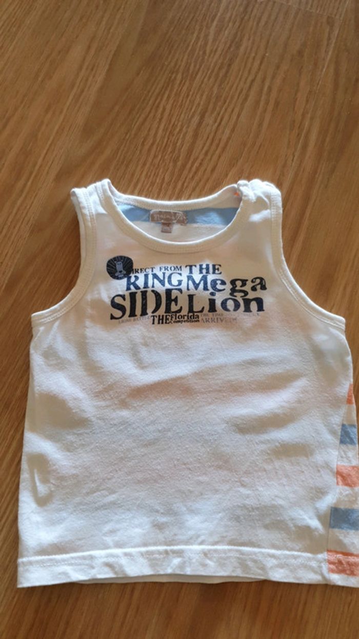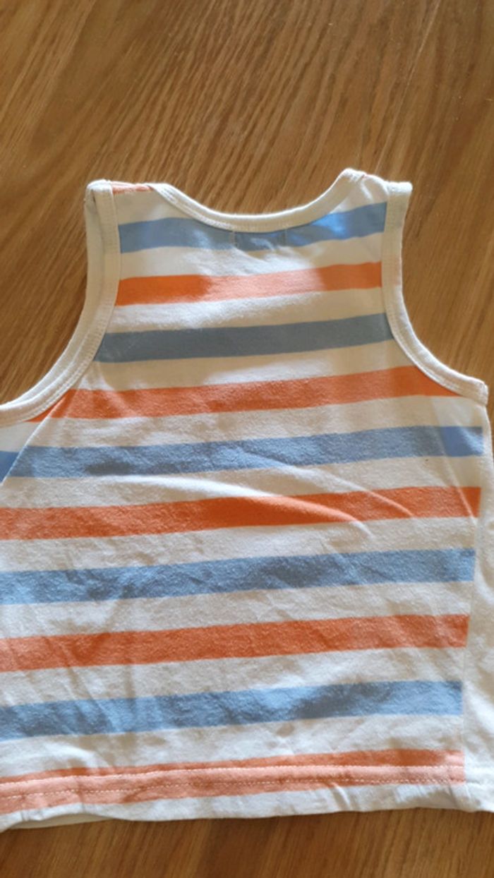 j ai adoré mettre ce débardeur a mon fils. taille 18 mois. micro taches sur le devant. j ai fait une photo ca se voit a peine