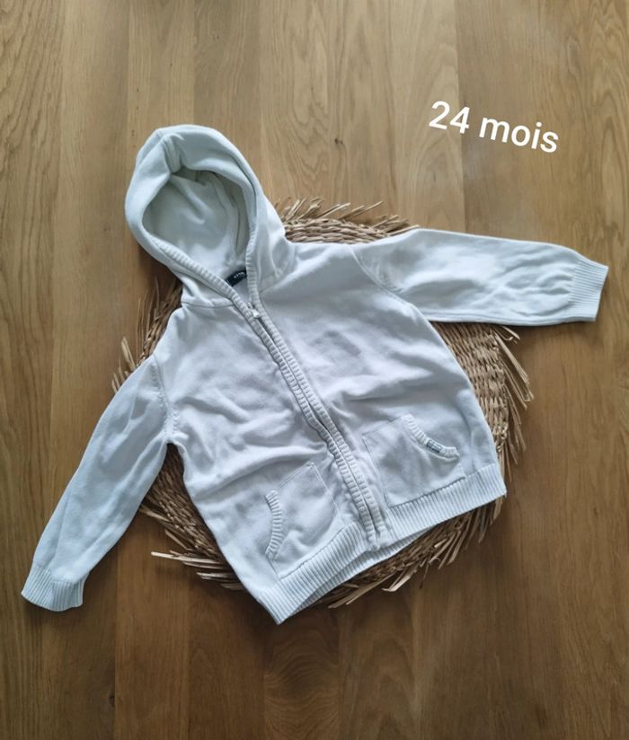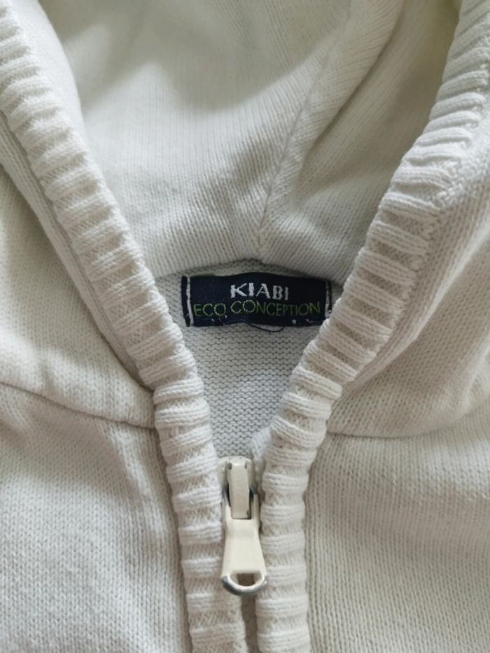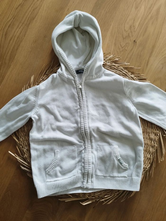 Gilet zippé à capuche blanc, de la marque Kiabi, en bon état, en taille 24 mois. La couleur blanche a perdu un peu de son éclat mais reste en bon état. N'hésitez pas à faire des lots 🌱