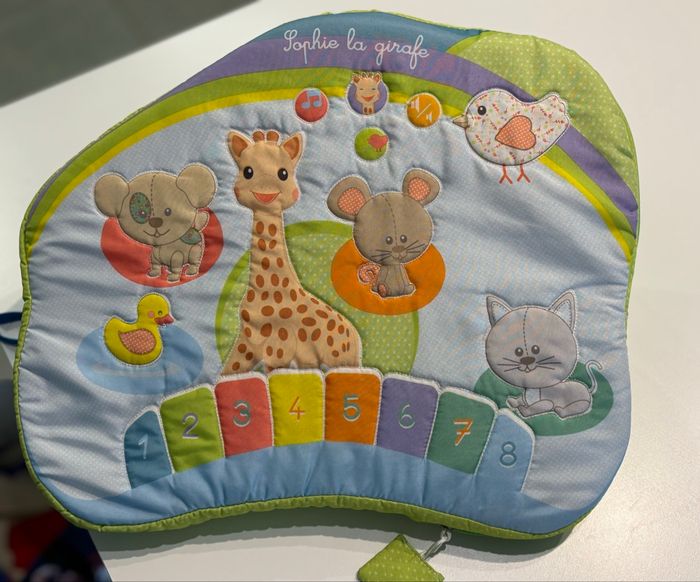 En parfait état! Avec ce jouet éducatif, les enfants de 3 mois et plus peuvent apprendre à reconnaître les premiers cris d'animaux. De plus, les petits ont leur premier piano à 8 touches. S'ils ne veulent pas jouer eux-mêmes, il est possible de revenir à l'une des 6 mélodies préréglées. Le plateau de jeu Touch and Play de Sophia la girafe s'utilise simplement en appuyant sur les touches. Le bébé apprend ainsi à utiliser ses mains, à se concentrer et à comprendre la relation de cause à effet. Le panneau est recouvert de mousse et la housse est lavable. De même, le volume peut être réglé.