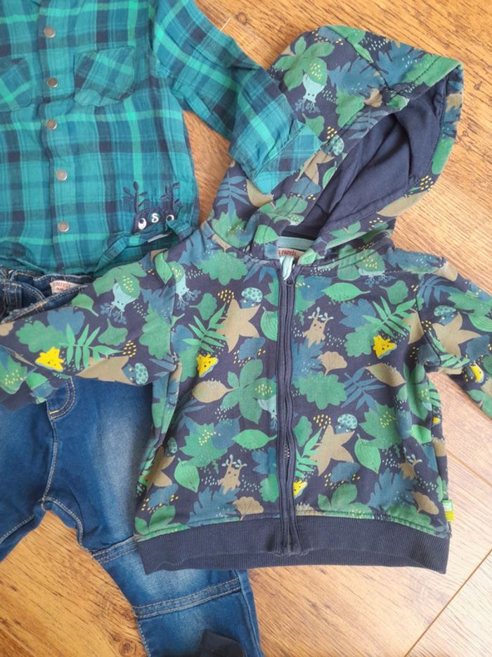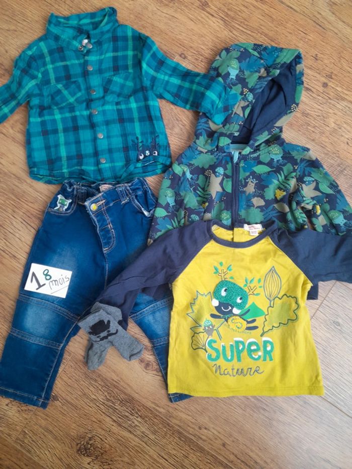 Ensemble 5 pièces composé D'un jean, d'un tee shirt manches longues, d'une chemise, d'une veste avec capuche et d'une paire de chaussettes. Tout est en excellent état en 18 mois Réduction intéressante en lot #18moisbabyestlé