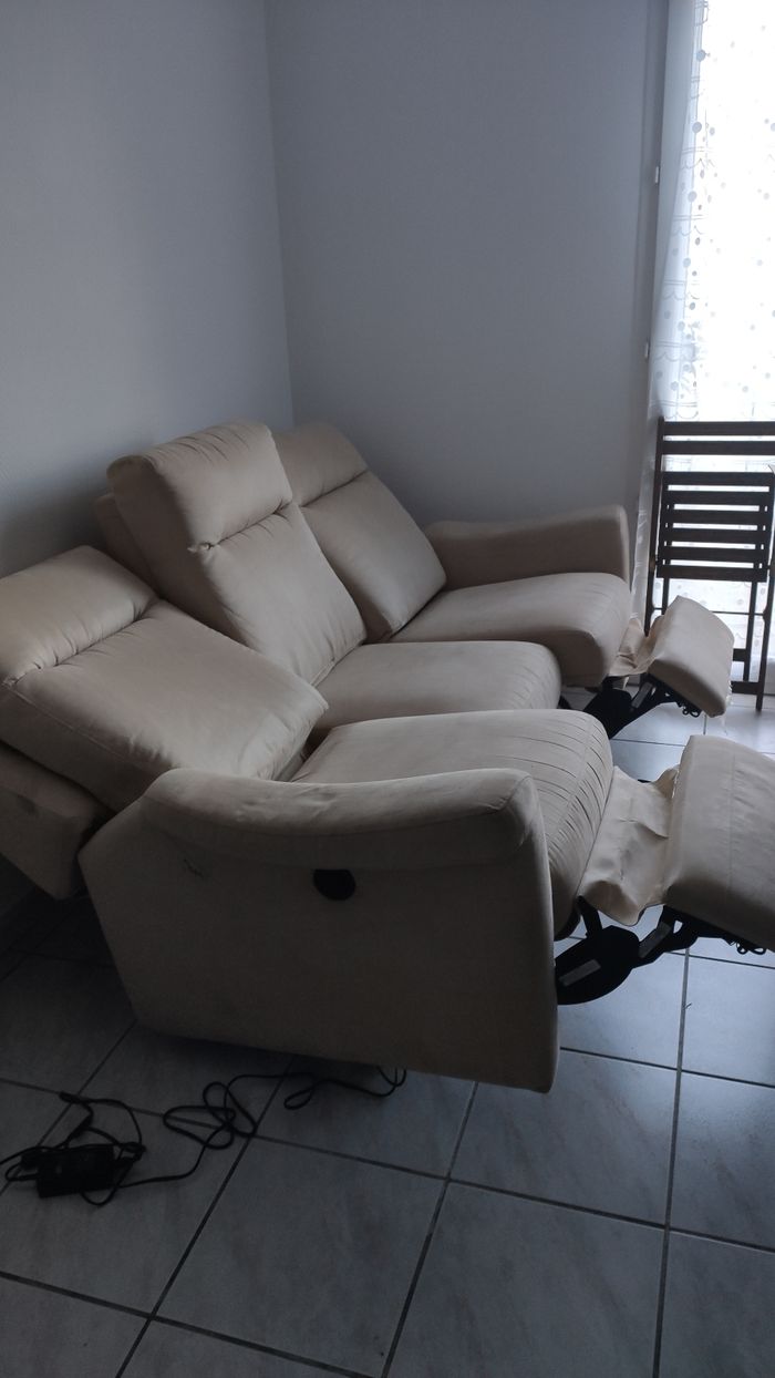 Bonjour, À venir chercher à mon domicile à Tournefeuille! Nous vendons notre canapé beige château d'ax 3 places dont 2 convertibles. Sur la photo, j'ai mis au maximum allongé le siège de devant et moins celui de derrière. Canapé très confortable mais qui a été stocké pendant quelques années sans être utilisé donc un peu sale. Sera shampouiner pour la vente ou négociable si pris en l'état. Canapé assez lourd à cause du moteur du relax. Merci