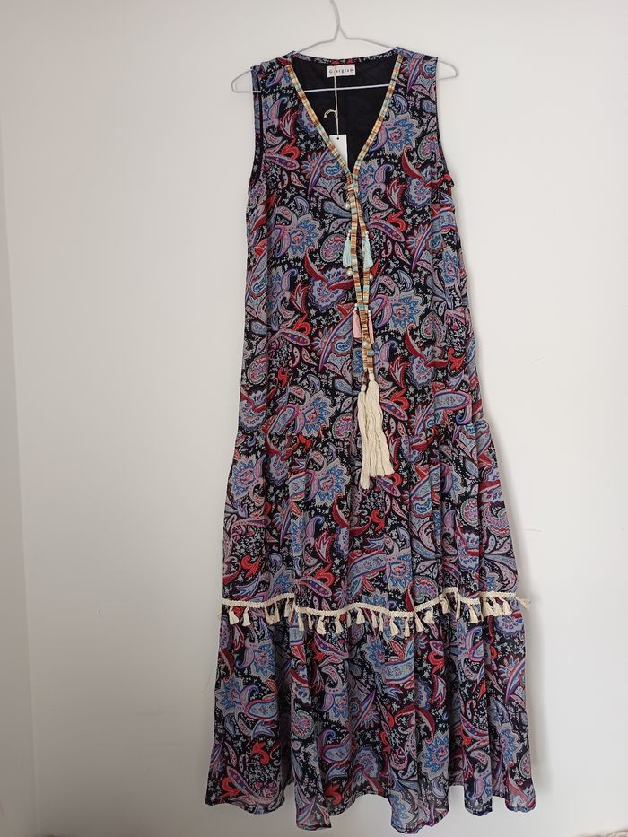 Longue robe noir a motif avecgio accessoire et pompon (Couleur : Noir - Tailles : S-M) Jamais porté, très belle robe sympa pour printemps/été. Vous avez la possibilité de faire des lots pour économiser sur la livraison et des remises sur le lot.