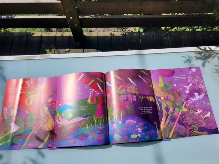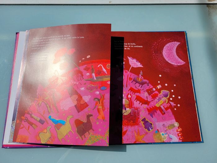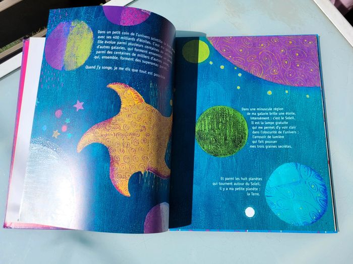 Un aller-retour fabuleux entre l'immensité de l'univers et la maison bleue d'un enfant. On voyage dans la Voie lactée, le système solaire… On plonge vers notre planète, les pays, les villes et même dans le cœur de ce petit Terrien, qui contient, à lui seul, toute la beauté du monde et ses mystères. Format 23,50 x 30,00 cm En très bon état à part un petit accroc sur la tranche (cf dernière photo) et les 2 pages d'un depliant qui ont été pliées Pour voir mes autres livres enfants : #livreenfantmooglou