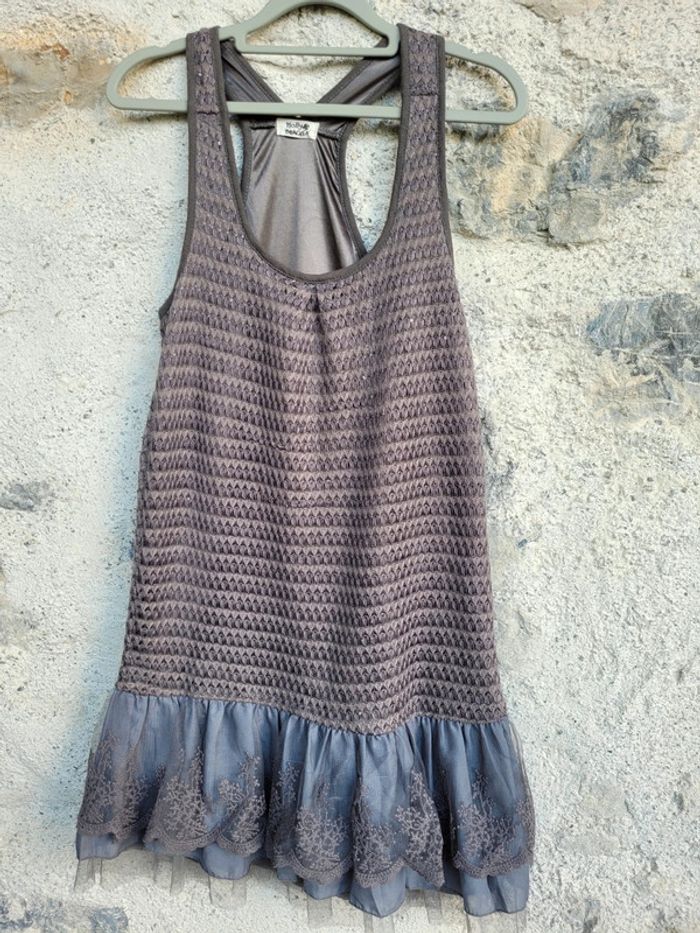 Très belle robe de la marque Molly Bracken de couleur grise dentelle en bas, style crochet avec sequin pour le buste, taille unique, très bon état