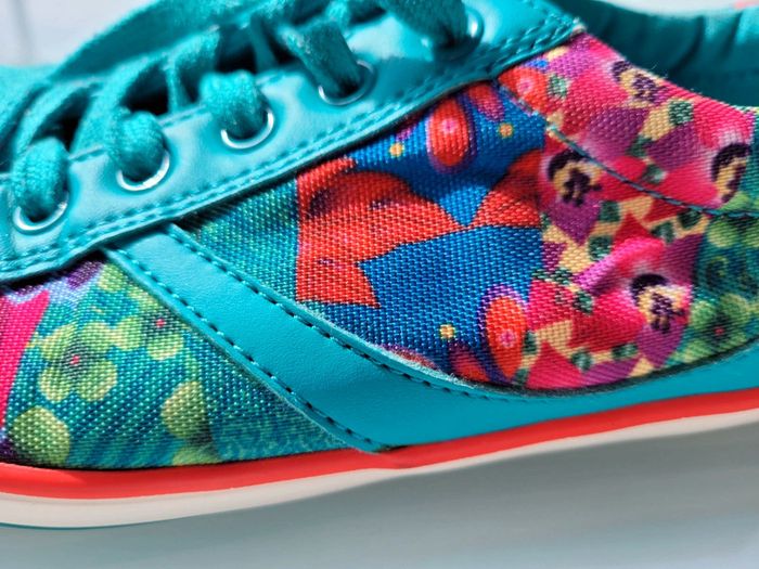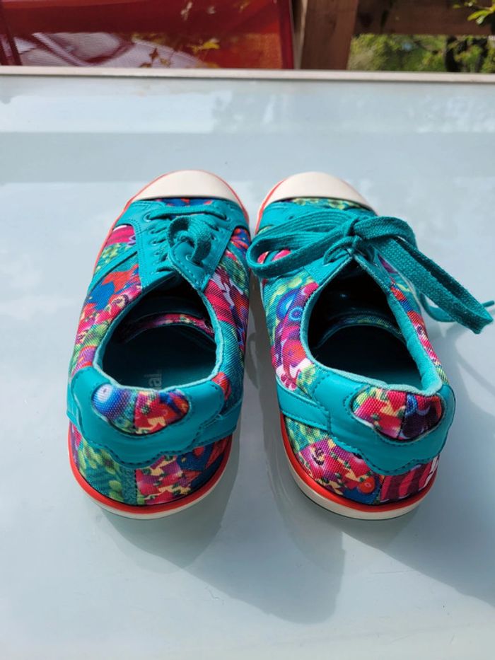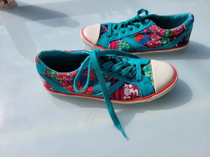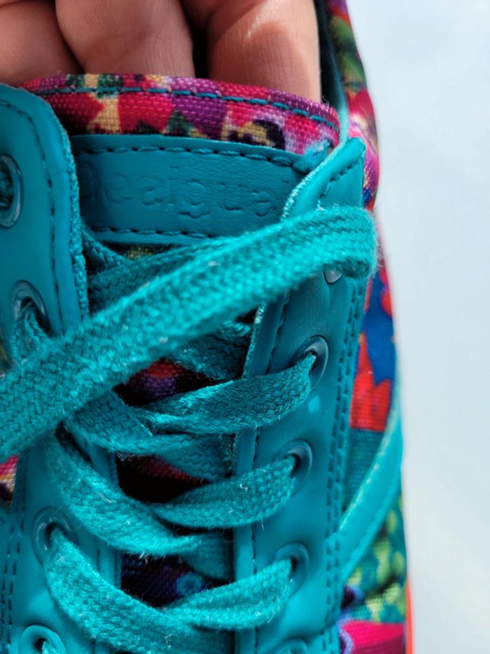 Superbes baskets en toile bleu turquoise et fleurs multicolores, de la marque Desigual, pointure 36, très bon état Pour voir mes autres chaussures : #chaussures36mooglou #desigualmooglou