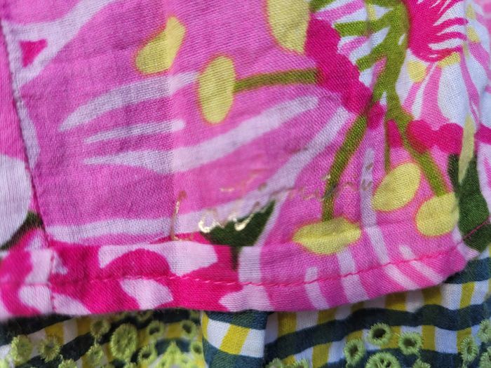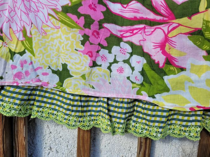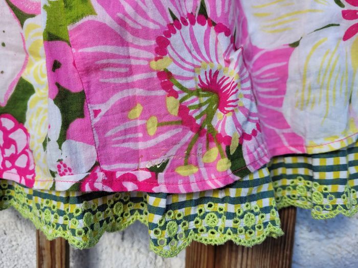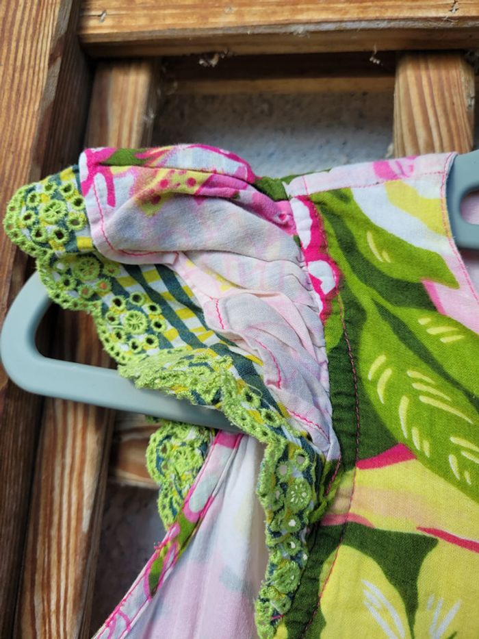 Superbe robe de la marque Catimini, colorée, tons roses, verts et jaunes, fleurs, sans manches, volants, 10 ans, très bon état Pour voir mes autres ventes en 10 ans : #10ansfillemooglou #catiminimooglou