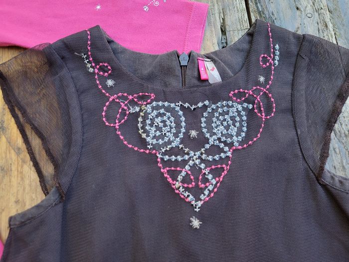 - 1 robe noire recouverte d'un tulle, broderies fuchsia arabesques et fleurs