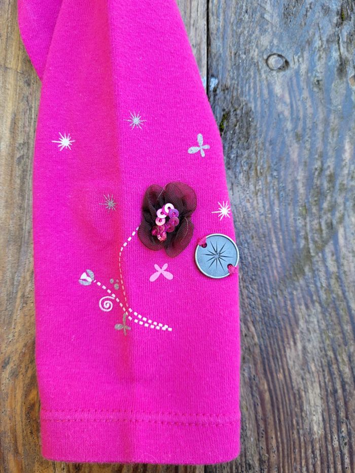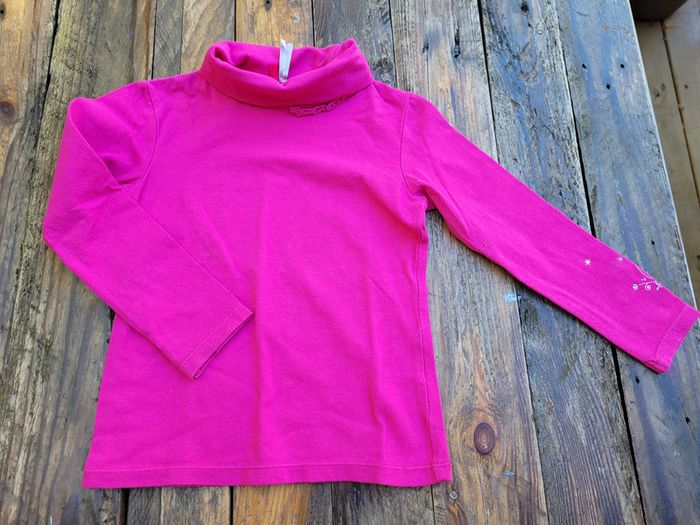 - 1 col roulé rose fuchsia, dentelle dans le cou, broderie et fleur tulle sur une manche