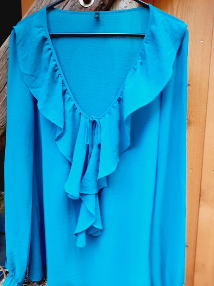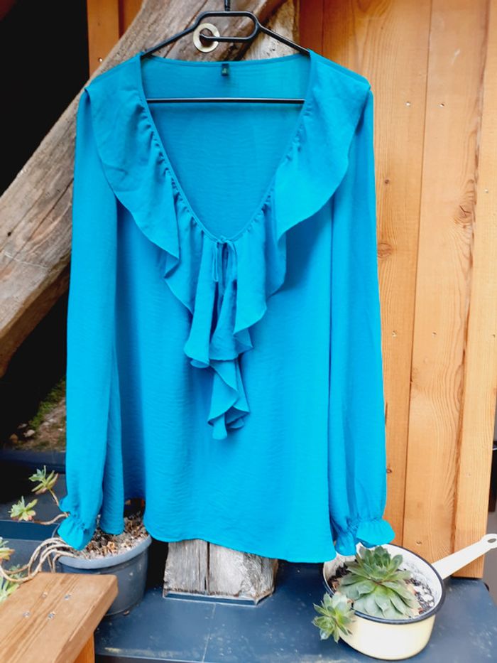 Superbe chemiede la marque Benetton, grand col V, bordé d'un volant, cintré aux poignets, taille L, très bon état