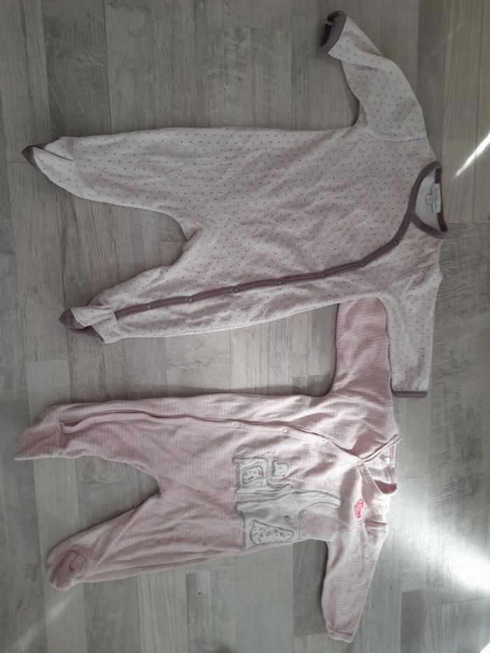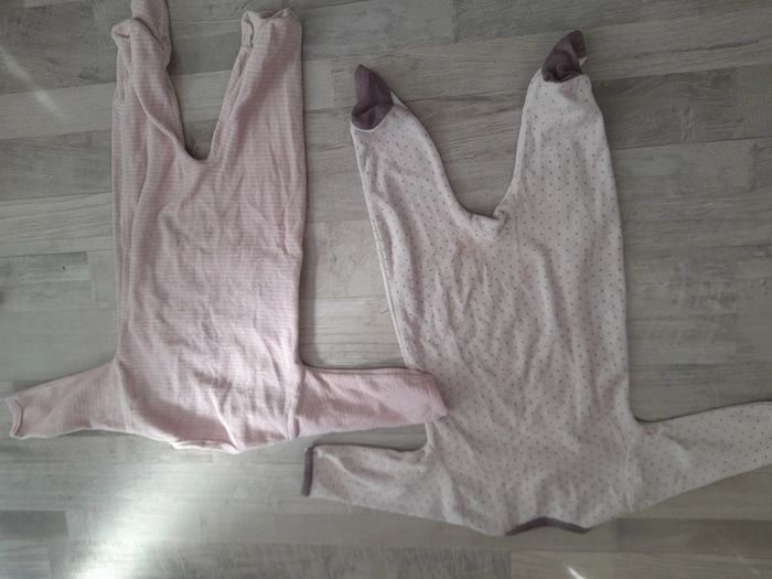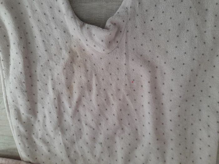 2 pyjama velours 9 m Celui à pois à une tâche orange L'autre un trou au pied et une tâche sur une pression 1 euros les 2